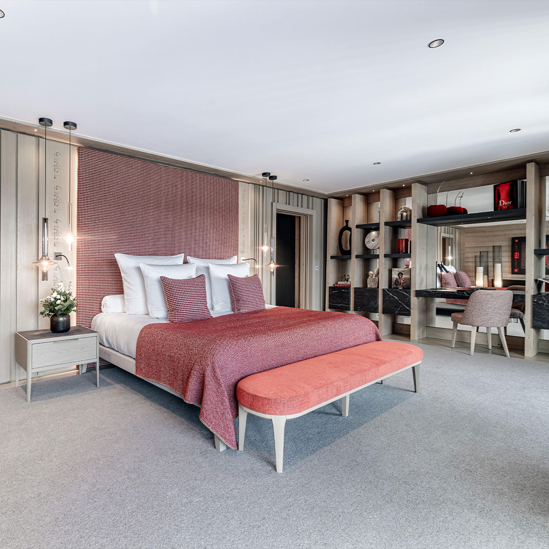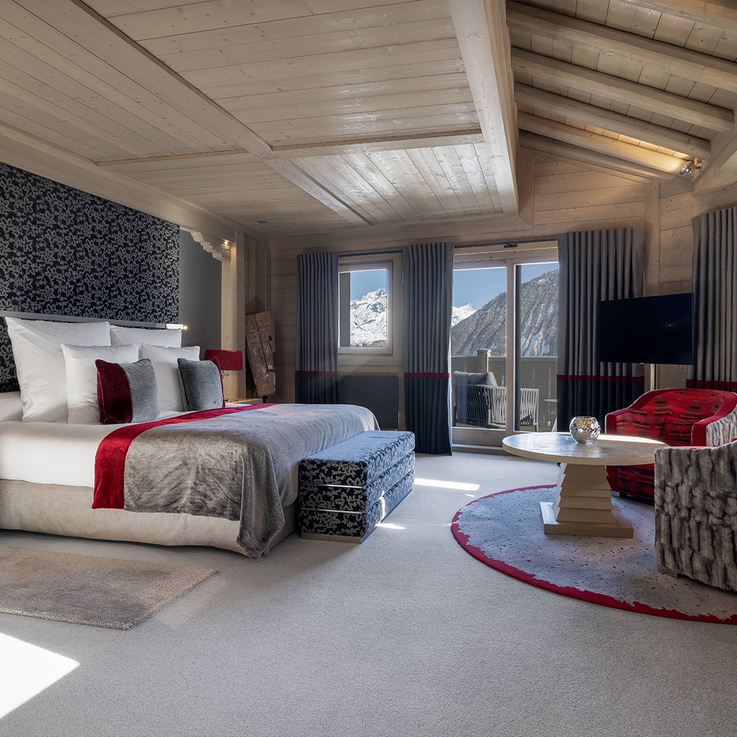 La plupart des chambres sont situées dans le bâtiment principal. Pour un hôtel de seulement 26 chambres et 8 suites, le nombre de catégories est d’ailleurs surprenant : les Standard sont étonnamment grandes, avec balcon privé et vues sur la montagnes, lit king-size, espace salon, machine Nespresso, iPad, wi-fi gratuit, rafraîchissements gratuits et salle de bains avec baignoire et douche à l'italienne. On imagine sans mal le niveau des somptueuses suites-chalets. La Suite-Chalet Baltoro, par exemple, s’étale sur trois niveaux, avec cinq salles de bains, piscine intérieure privée, hammam, personnel dédié, chef privé, et thé gratuit l'après-midi. Sans parler de l’accueil au champagne…