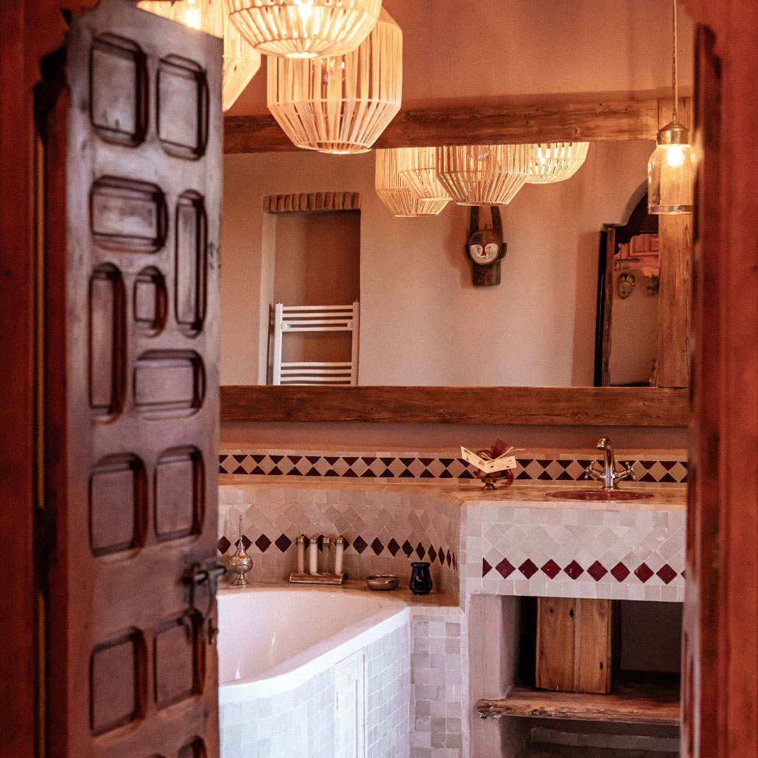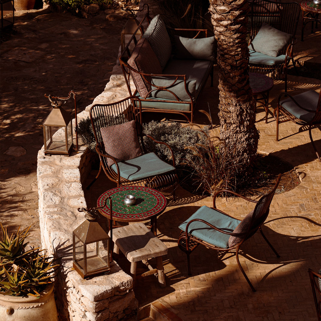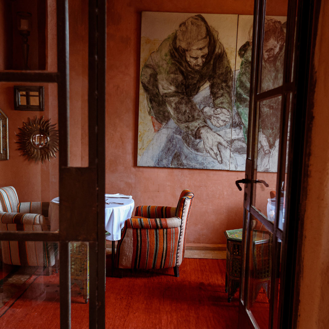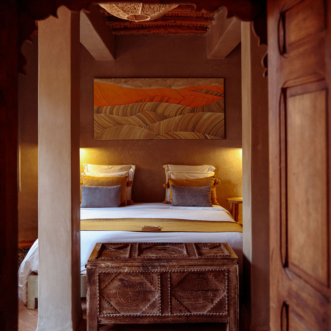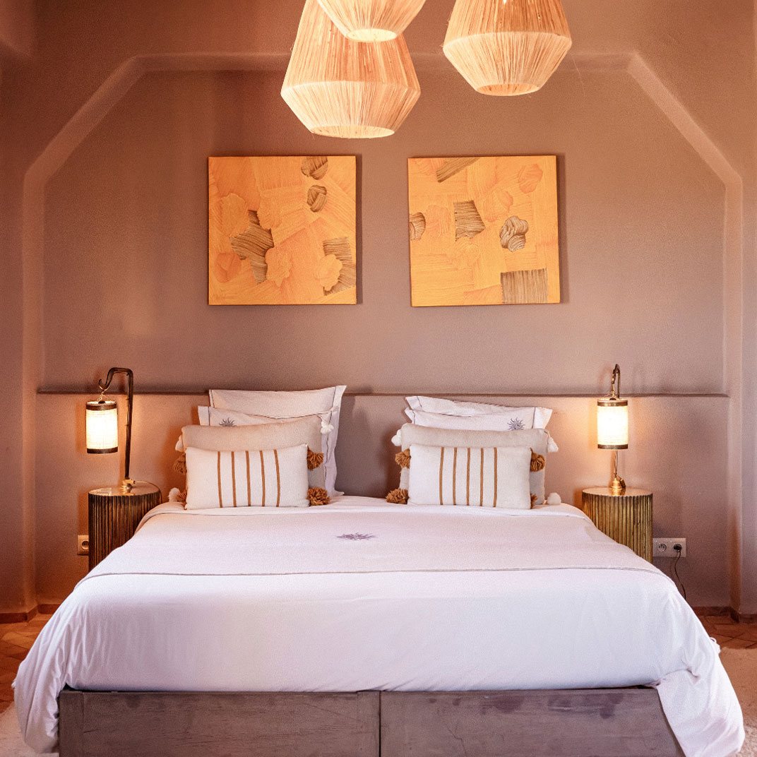 Des mosaïques traditionnelles aux tapis berbères, partout pièces artisanales et œuvres d’art marocaines mêlent leurs riches couleurs à celles de la végétation et du Tadelakt qui habille les murs. De lourdes portes en bois s’ouvrent sur des chambres et des suites à la décoration unique. Les équipements varient, mais on retrouve dans chacune des sols en bejmat (carreaux en terracotta), des draps Balzatex (boutique basée à Casablanca) et de somptueuses douches à l’italienne remplies de produits de bain locaux à l’huile d’argan. Deux choses que vous ne trouverez pas dans votre chambre : une télévision et un téléphone, sauf si vous en faites expressément la demande.