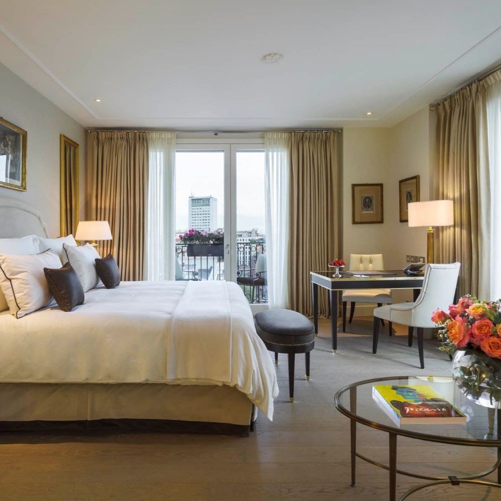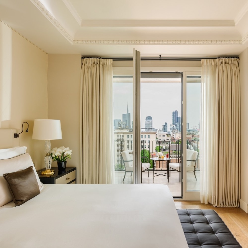 L’entrée, entre colonnes de marbre et grand escalier, ne pourrait être plus impressionnante. À l’étage, chambres et suites arborent deux ambiances, entre luxe contemporain à la milanaise et style parisien soigné, mais passées les premières impressions, toutes proposent bien sûr les mêmes touches de luxe, avec des terrasses et balcons, et de superbes salles de bains garnies de produits Clarins.