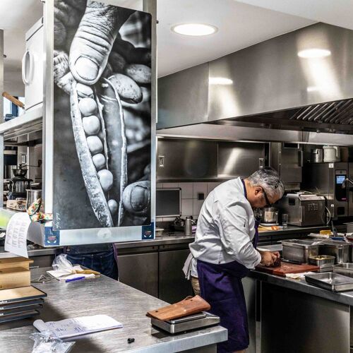 "Au-delà de l'exigence que nous avons à l'égard des produits que nous sélectionnons, nous supprimons au maximum les emballages à usage unique, les bouteilles en plastique et les détergents polluants, nous mettons en place un tri sélectif rigoureux (y compris les coquilles des fruits de mer) et fabriquons notre compost végétal et substrat pour nos maraîchers."