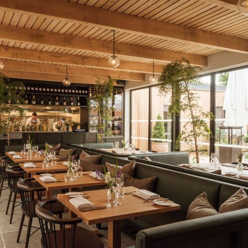 ‘Immaculate’ is the best way to describe this beautifully restored 19th-century property, located in a pretty village and surrounded by manicured grounds. The pub area is all country warmth and roaring fires, while the restaurant is bright and modern thanks to its floor-to-ceiling windows. The menu aims to please all-comers, with steaks and burgers joined by more elaborate preparations like sea bass with Morteau sausage and girolles. Make the most of the spectacular renovation by staying the night in one of the 10 bedrooms, split between the main house and courtyard.