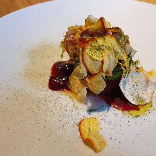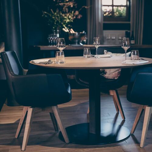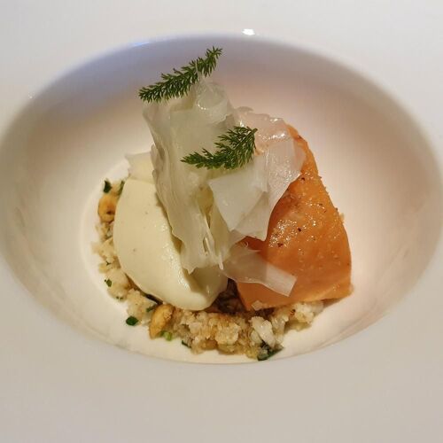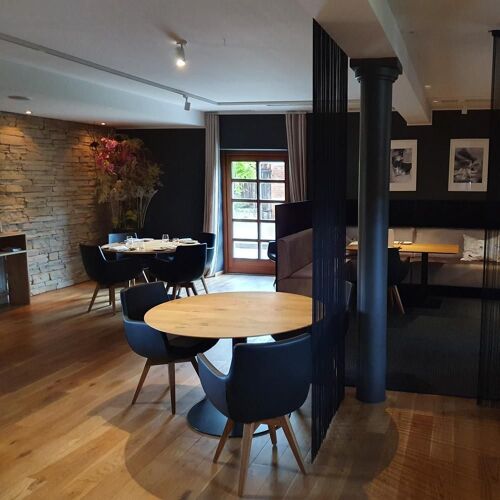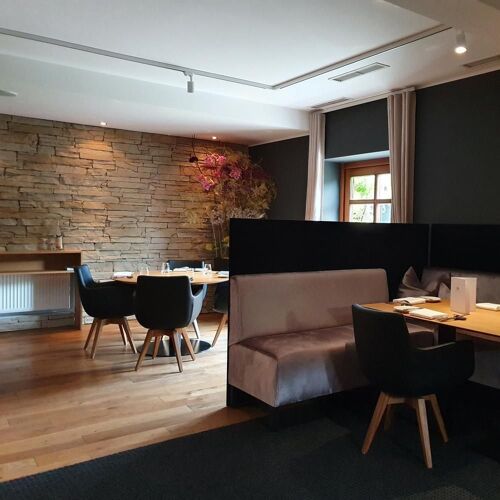 Set in a small village, this former farmhouse has been given a fabulous facelift that retains much of its original character while introducing modern details. Wood and stone features blend tastefully and elegantly to create a chic, stylish interior. Chef-patron Martin Grimmer proposes a creative seasonal set menu (a vegetarian version can be ordered in advance). His cooking involves original ideas and subtle combinations – the appetisers, too, hit the mark. His charming wife Vera, who presides front of house, is on hand to propose excellent wine or alcohol-free drink pairings. On Saturdays you can come for the"Gourmet Lunch". Tip: The spice bread that they bake in-house is also available to buy as a baking mix to take home with you. The barn is an ideal party venue. If you can't find a parking space at the restaurant, head for the meadow located about 200m away.