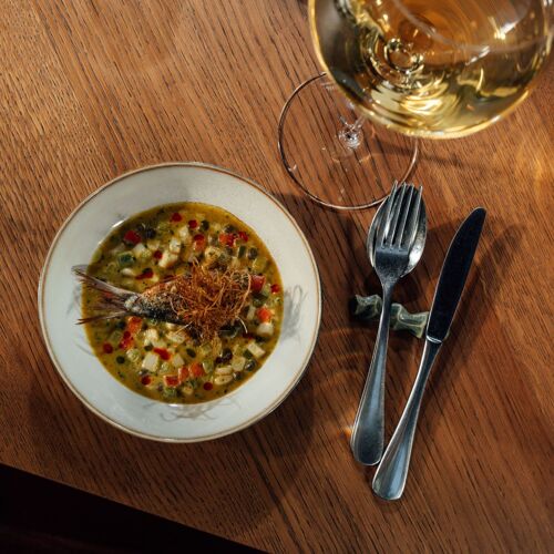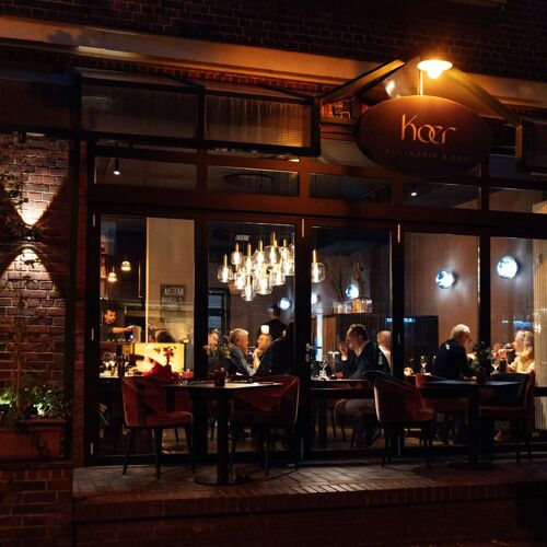 A brilliant combination of restaurant and bar! Their "modern, market-fresh cuisine" is served in the form of creative dishes, such as smoked sardine and razor clams from the Dutch coast with grilled peppers, capers and pickled coriander seeds. We recommend opting for the surprise menu, but there is also an à la carte selection that includes bar snacks – it is well worth trying their own creations from the cocktail list. Good to know: Alcohol-free beverage pairings are available for the set menu. A pleasantly lively and fun atmosphere reigns in this chic restaurant. The name is derived from the Low German phrase in de Köör gahn ("to make a choice") and refers to the establishment's dual concept.