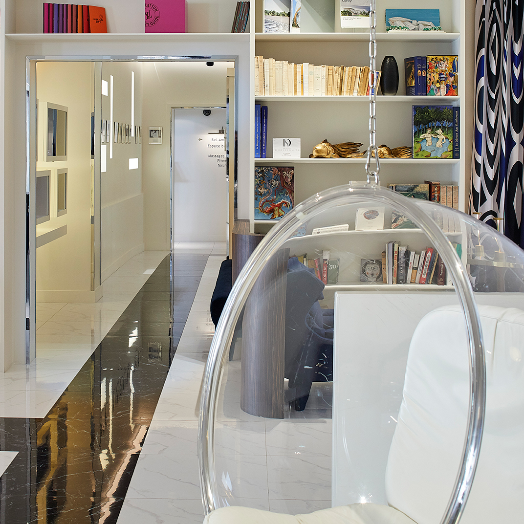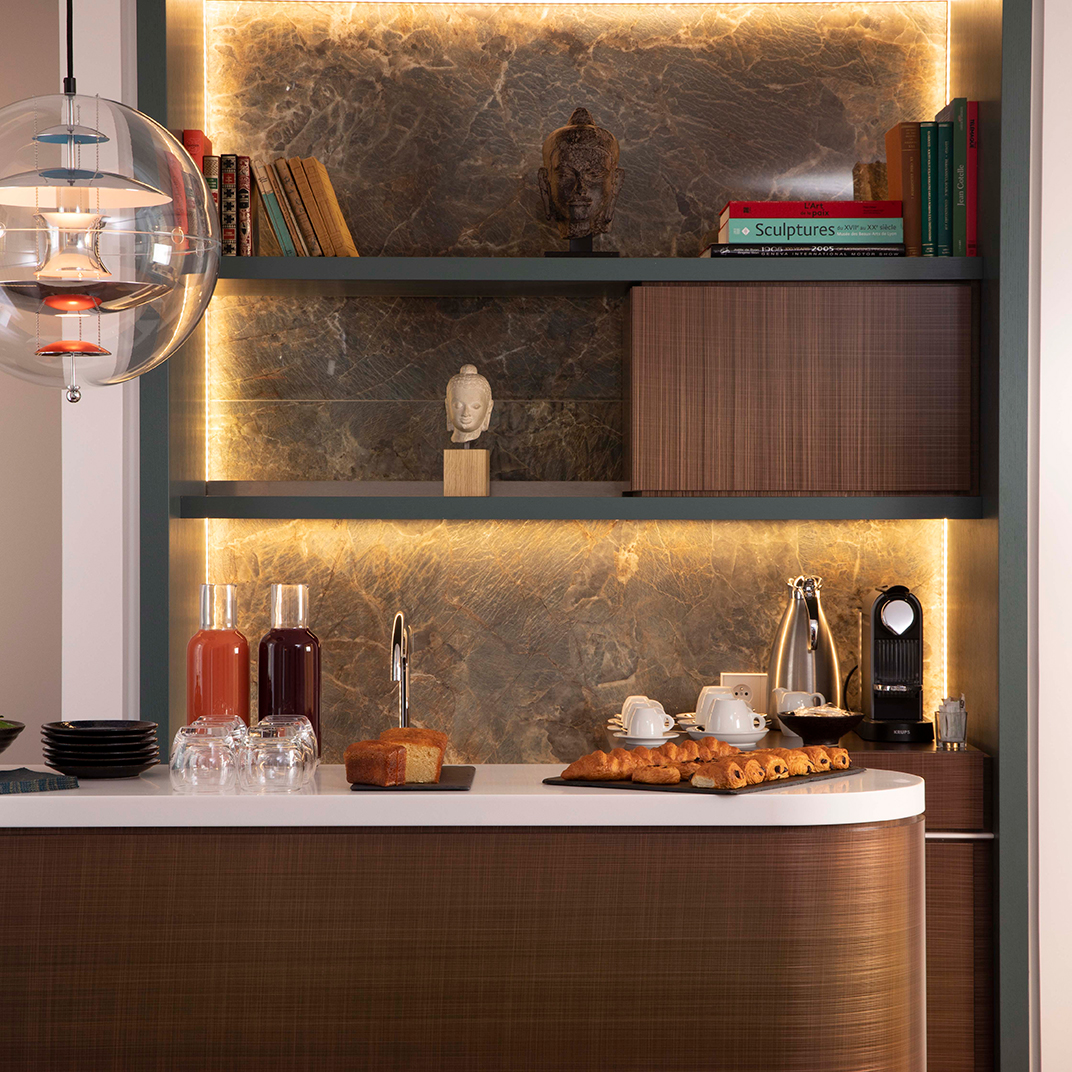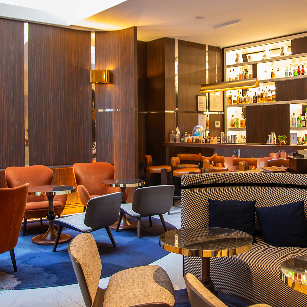 All'estremità della lobby, un salotto separato con caminetto e dotato di attrezzature audiovisive, con capienza fino a dieci persone, è l'ideale per piccole presentazioni o semplicemente per rilassarsi. Di fronte a questo spazio ideato per i meeting, troviamo un bar che, decorato in mosaico color rame, mette a disposizione un ambiente funky per un drink dall'ora del cocktail fino a tardi. Lo spazio dove accomodarsi è delineato da una parete di canne di bamboo e tavoli semplicemente lavorati in frassino.