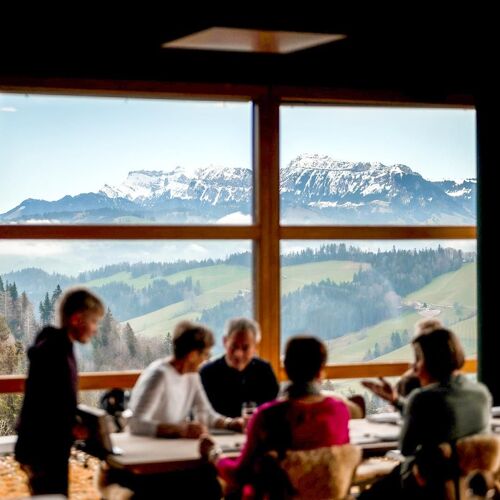 Circondato da una natura incontaminata, questo luogo situato a 1.052 metri sul livello del mare, nella Riserva della Biosfera dell’Entlebuch, sembra un mondo a parte. Fra montagne e valli, prati e boschi, questo universo incontaminato cela i più diversi ingredienti e sapori. La cucina alchemica di Stefan Wiesner, ispirata alla natura, fa parte di un’esperienza unica, affascinante e talvolta provocatoria: una sorta di cerimonia personale che vale la pena di vivere. Si inizia con il discorso di benvenuto dello chef-proprietario, seguite da uno sguardo sul suo mondo artistico e dalla partecipazione degli ospiti alla rifinitura degli alimenti e all’impiattamento. Il menù fisso, che cambia a seconda delle stagioni, è imperniato sul tema del fuoco, e lo chef introduce ciascuna delle nove portate con una piccola narrazione. Per rendere giustizia alla splendida vista, questa straordinaria esperienza culinaria inizia a mezzogiorno. I coltelli sono realizzati da Jo Wiesner, figlio dello chef, la cui fucina si trova sul posto. È possibile pernottare presso l’hotel Weitsicht, che ospita anche seminari esclusivi.