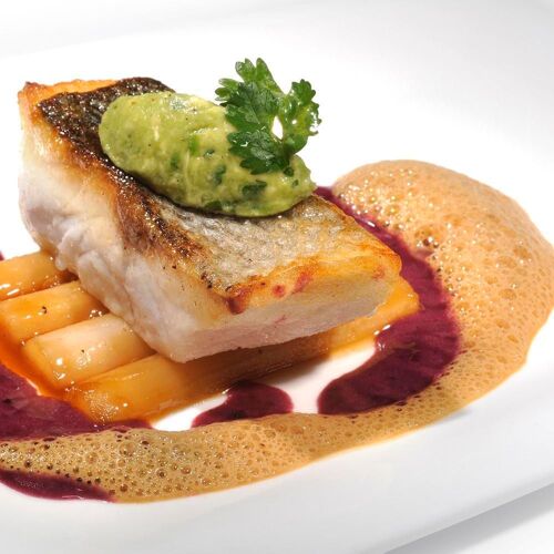 A porthole window in the entrance area provides a peek into the kitchen, setting the stage for an evening of gastronomic pleasure from the moment you arrive. Once seated at your impeccably laid table, you can appreciate the elegant setting and attentive and professional service overseen by your host and sommelier, Laura Simon. With her refreshingly straightforward manner enhancing the welcoming ambiance, chef-patron Elmar Simon creates contemporary dishes rooted in classic cuisine. There are two set menus: one with meat and one vegetarian. The courses from both can also be ordered à la carte. The superior quality of ingredients and the chef's knack for creating harmonious combinations of elements and flavours are showcased in dishes such as the outstanding, firm-fleshed Breton turbot, accompanied by broad beans, horseradish and an intensely flavoursome beurre blanc sauce.