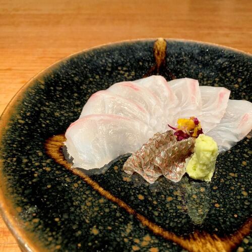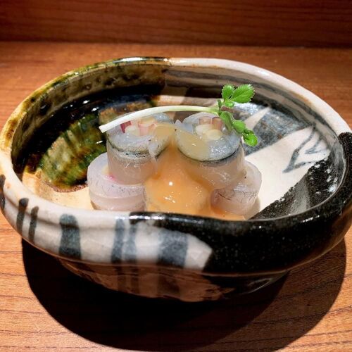The chef cultivated his free-ranging creativity at a Naniwa kappo, his genial customer service at a bistro. His creative flair is on full display in his combinations of ingredients. Pairings such as sweetfish with peach, barracuda with persimmon, and Spanish mackerel with apple marry fish of the season with the sweetness, tartness and flavour of fruit. Great care is taken to offer a wide selection of organic wines that have affinity for each offering. The chef’s philosophy is that originality must be firmly grounded in the basics, and his cuisine attests to it.