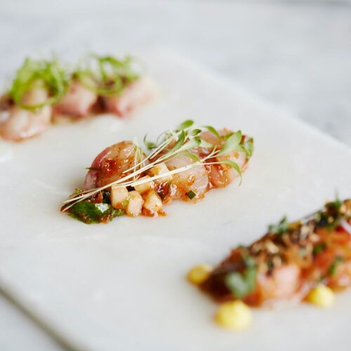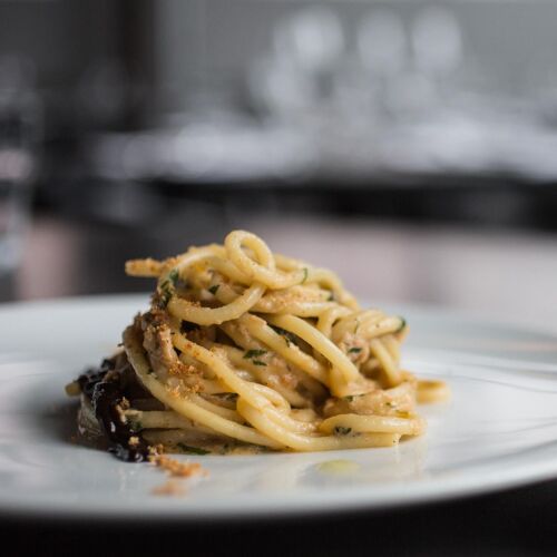 Housed in a warehouse of this former foundry turned contemporary art center, this location blends contemporary elegance with industrial heritage. Exposed brickwork, large windows, and metal furniture create an artfully unfinished, minimalist decor. Here you can enjoy carefully prepared Italian and Mediterranean-inspired cuisine. The concise but cleverly devised menu features dishes ranging from light and fresh to warm and comforting. The crudos draw on the vibrant flavors of citrus fruit and herbs; the indulgent pastas are deeply satisfying—think caramelle with a mushroom ragout, hazelnuts, and a guinea fowl mousse. As for meat options, the venison haunch with smoked celery root and cranberry remoulade is a real house classic.