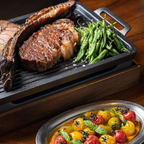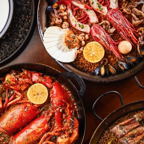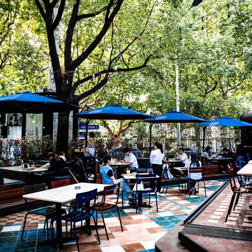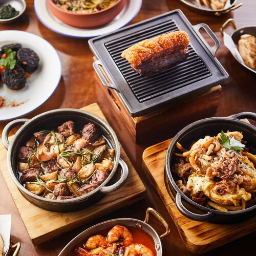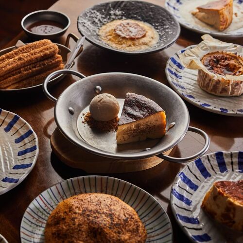 Judging by its name, this restaurant on a corner strives to create the buzzing vibe of a market; judging by the blue and white stripes on its sign, it has a nautical theme. Yes and yes. Imported seafood such as live oysters, scampi, carabinero shrimp and baby eel are deftly prepared in myriad ways. The signature Spanish seafood stew loaded with umami has to be pre-ordered. You can enjoy alfresco dining on a sunny day or reserve a private room for groups.