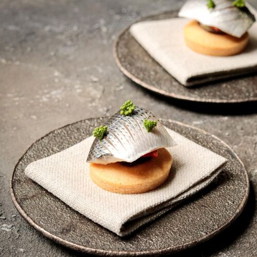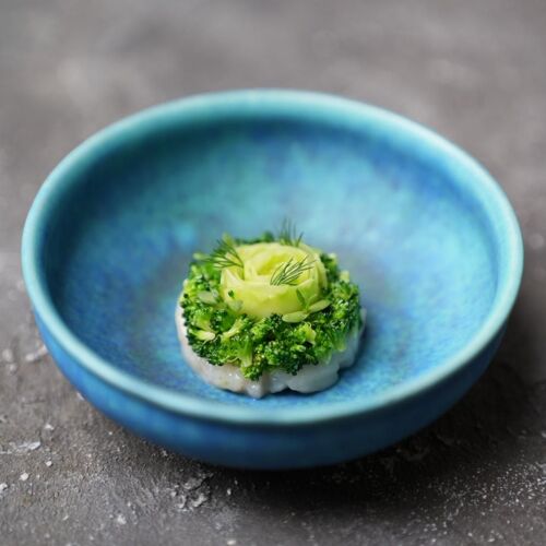 The dim interior suggests the depths of the ocean—the abyss—or the deep green of the forest. Pursuing the theme of ‘sea and mountain’, seafood and vegetables are combined in dishes that convey the bounty of Japan’s seas. The chef first understood the appeal of seafood while staying in Marseilles. Land and sea are united by the turning seasons; the clear streams of mountain uplands become rivers below. This is the eternal cycle by which the land is replenished and the ocean is refreshed. The laws of nature expressed in cooking.