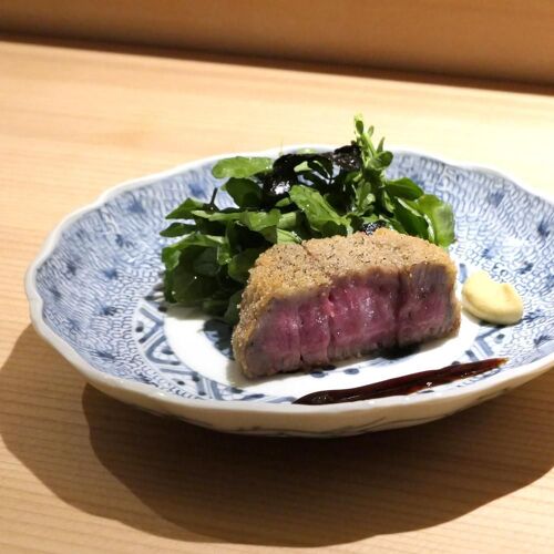 The name is both a play on the owner’s name and a prayer for everlasting prosperity. The menu combines kaiseki and beef, showcasing Japan’s famous wagyu. Tsukuri and wanmono start the evening, celebrating the season. A procession of wagyu variations follows: beef-tail spring rolls, char-grilled tongue, and a main dish of beef cutlet. Japanese and beef dishes delight in equal measure.