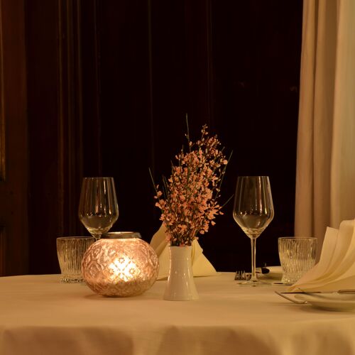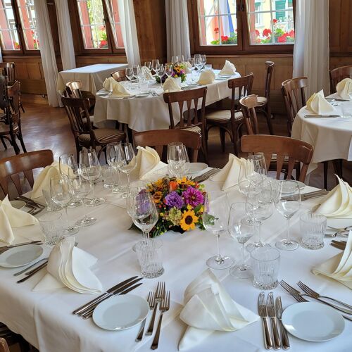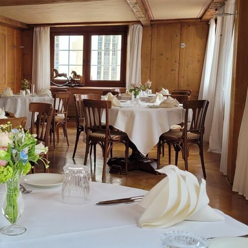 La sala del ristorante, situata al primo piano di una casa a graticcio del XVI secolo, offre un’atmosfera piacevolissima: l’ambiente è accogliente e rustico, ed è completato da un piccolo giardino d’inverno con vista sul lago (senza parlare dell’incantevole dehors). Il menù propone una cucina di ispirazione tradizionale con tocchi stagionali, tra cui spiccano classici come l’entrecôte di manzo Hereford e il fegato di vitello fresco. Il servizio attento e competente, così come i consigli sui vini, sono forniti dal sommelier.