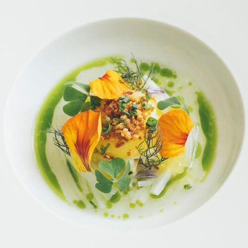 The Kavaliersbau (squire's lodge) of Hohenheim Castle, in a quiet location outside the city, is a haven for the discerning foodie. This is thanks in no small part to Stefan Gschwendtner, who puts his own stamp on bold, precisely crafted, very intelligently structured dishes. In the process, he elevates the ingredients to stardom, allowing their intrinsic flavours to take centre stage. Take, for example, the char from Birnbaum fish farm, which is wonderfully tender, almost raw, subtly tempered and lightly salted. The set menu comprises seven courses. On Mondays, Thursdays and Sundays, a shorter version with five courses can be ordered in advance. First-rate service comes courtesy of a friendly and highly adept front-of-house team armed with astute wine recommendations. Non-alcoholic pairings are also available to accompany the set menu. In summer, this elegant restaurant expands onto the delightful terrace.