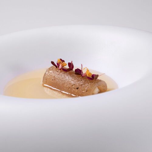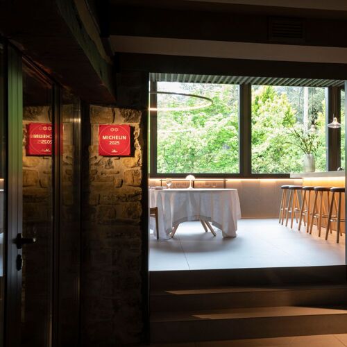 The last thing you expect in an old stone mansion such as this, which has witnessed the passing through of pilgrims heading to Santiago de Compostela along the Way of St James over the centuries, is innovative cuisine that is well worth a break in your journey. Its interior is both rustic and contemporary in style, with two separate sections: the informal dining space at the entrance (Origen restaurant), where the only option is an affordable traditional menu, and the more refined gourmet dining room upstairs (with just three tables) where you can eat while watching the chefs at work. Chef David Yárnoz prepares sincere, creative cuisine that is highly appealing in terms of both its presentation and flavour, and always showcases the outstanding ingredients found in the Navarra region (pork from Lekunberri, vegetables from Tudela, trout from the Baztan area, game from de Errea, eggs from the Iza valley etc) and a strong commitment to the local region. This is demonstrated on a single surprise menu (Clásicos & Evolución) featuring the restaurant’s signature dishes, such as the legendary paprika candy with a Chistorra mousse, alongside its more recent creations.