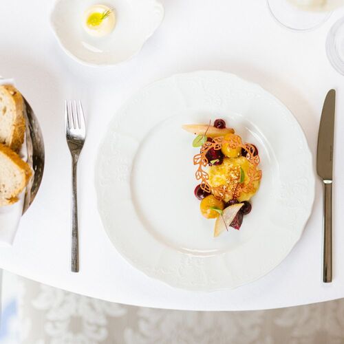 What could be better suited to this time-honoured setting than classic Czech cuisine? The lavish restaurant of the venerable Grand Hotel Pupp is housed in a magnificent space boasting high ceilings, an abundance of mouldings and stylish details such as fine chandeliers and mirrors, elegant fabrics and heavy curtains, all exuding a sense of history. An adept front-of-house team serves classically rooted cuisine with Czech and international influences. Both a set menu and à la carte options are available.
