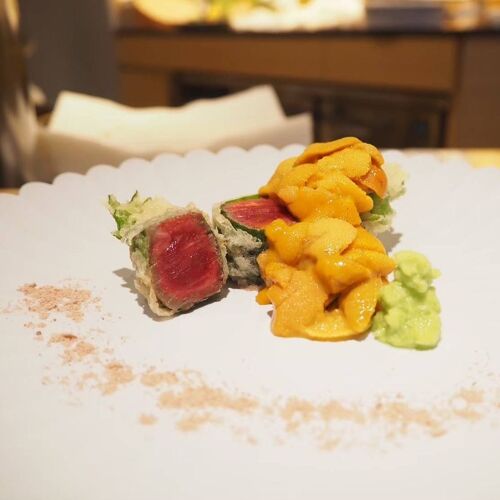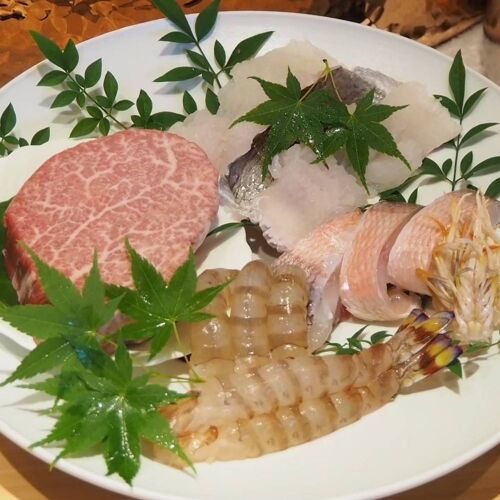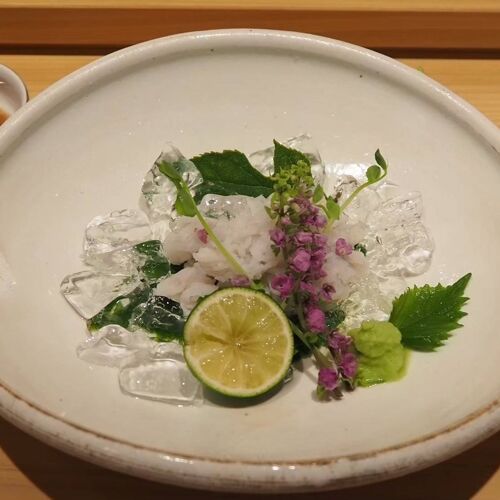 The tempura here shows an awareness of the start and end of each ingredient’s season, reflecting the chef’s experience in Japanese cuisine. Thinly battered items are lightly fried in safflower oil to convey their flavour plainly and honestly. Tiger prawn and cod milt are wrapped in perilla leaves for added fragrance. Wagyu fillet is grilled to a rosy pink with consummate skill. Red pickled ginger added to kakiage (all-in-one seafood and vegetable tempura blend) is a unique touch that is pure Osaka.