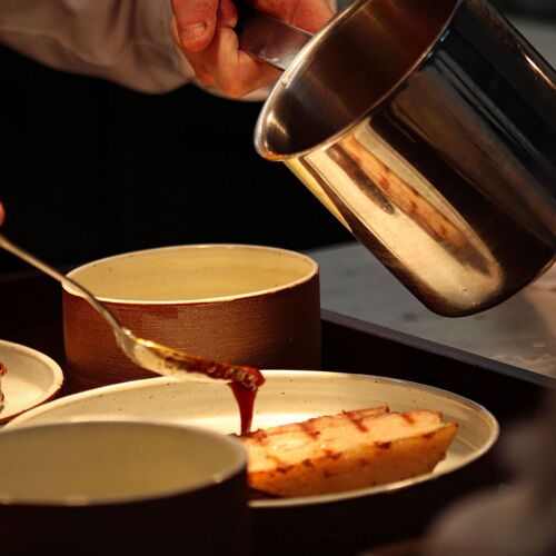 Located in the Manoir de la Mortière, a carefully restored medieval fortified house, this bistro has an inviting decor featuring textured lime-washed walls, old beams, terracotta floor tiles and an original fireplace. The food sets a sincere and inviting tone, thanks to carefully prepared traditional dishes. The poached egg in red wine sauce kicks things off nicely, then comes the pearlescent hake accompanied by a creamy potato risotto. For dessert, a warm chocolate soufflé rounds off the meal on an indulgent note.
