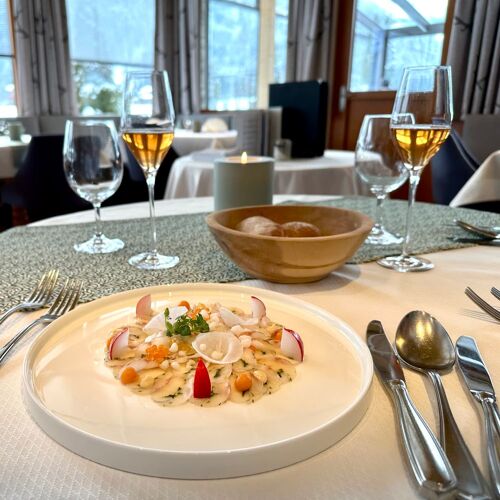 This is the somewhat simpler and entirely regionally oriented alternative to the Gründler family's small restaurant Gourmet Stüberl. Also located in the Hotel Alpin, the same high cooking standards apply – the food is clearly structured, very carefully prepared and fresh as can be. Shining examples include trout carpaccio, radish, caviar, pumpkin, crab crunch, or lamb liver, apple, potato cream, peas, bacon. The space is bright, the atmosphere friendly, the service attentive and proficient. The excellent wine list has over 250 labels, with Austria particularly well represented.