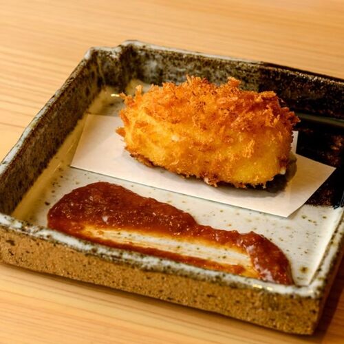 Novel ideas meet time-honoured craftsmanship. The signature snack is cream croquette of tiger prawn, dressed in a reduction of shrimp miso. Deep-fried items are also offered, bringing a satisfaction rarely found at sushi shops. For its part, the sushi is prepared traditionally: brined, marinated or simmered. In part because of his language skills, the chef was tapped to cater a dinner meeting between the Japanese and American leaders.