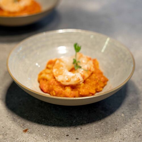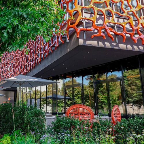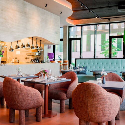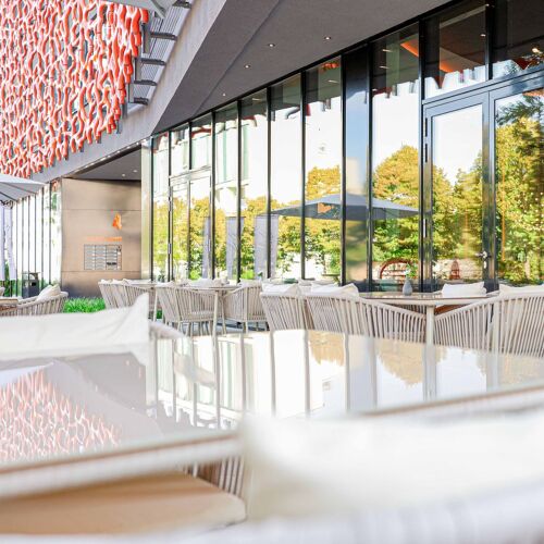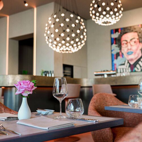 Trendig-chic und luftig-licht kommt das Restaurant hinter der originell designten orangefarbenen Fassade daher, dafür sorgen der modern-reduzierte Look samt drei markanten Kunstgemälden und offener Küche sowie die große, bodentiefe Fensterfront, die es schön hell macht. Die international-saisonalen Gerichte gibt es z.B. als "Zweierlei vom Yellowfin Thunfisch, Romanesco, Blumenkohl, Artischocke" oder "Reh vom Gutshof Polting, Pfifferling, Sellerie, Wassermelone". Am Abend serviert man zwei Menüs mit vier oder sechs Gängen, eines davon vegetarisch. Alternativ können Sie à la carte wählen. Mittags kommt der fair kalkulierte Business Lunch in drei Gängen gut an, auch als Vegi-Variante. Eine Bar hat man ebenfalls - hier können Sie auch einfach auf einen Drink sitzen. Schön die Terrasse vor dem Haus.