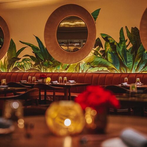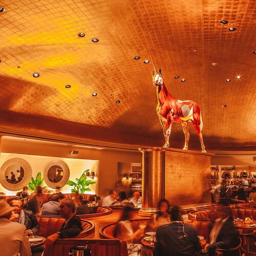Damien Hirst's giant sculpture of a gilded woolly mammoth resides famously behind the lavish Faena Hotel. Such scale and grandeur is also the norm in this restaurant, overlooking the iconic attraction. Pao’s oval room is capped with a gold-dome ceiling that's centered around yet another statue by Hirst—a golden unicorn perched on a platform looming large over the stylish guests.