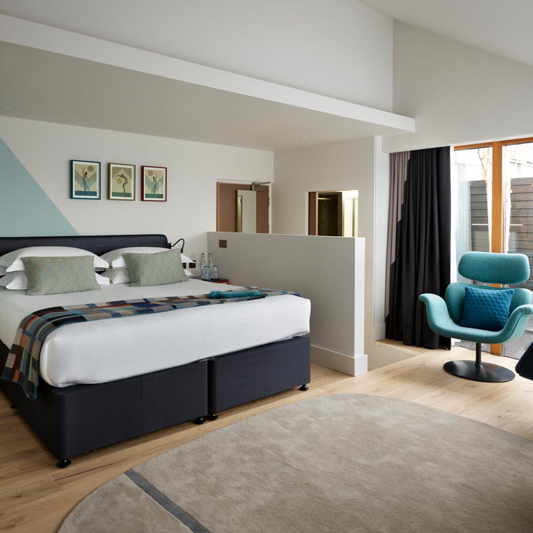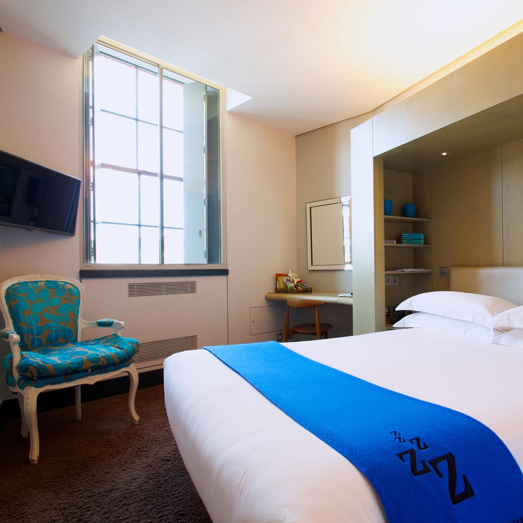 Architects Chetwood Associates, best known for their sustainable Sainsbury’s supermarket at Greenwich Peninsula, have worked their environmentally conscious magic on this site as well, using cold water from the near-forgotten London Aquifer to absorb waste heat, saving space and electricity by eliminating the need for a massive central air-conditioning apparatus, and to flush waste water, reducing the demand on London’s clean drinking water. Access to pressurized water at a constant temperature also means less space need be given over to water storage, thus increasing the number of guest rooms, a bottom-line benefit you don’t have to be a Greenpeace member to appreciate.