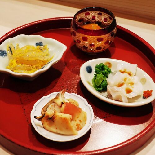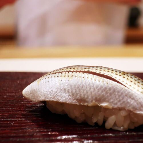 A chance encounter with a single book sparked a lifelong connection with sushi for this chef. His omakase unfolds like a ninjo rakugo performance—beginning with light snacks, before moving into the main story: sushi. The sushi itself progresses like a narrative, a light opening act with squid, building through tuna, cresting with gizzard shad, and tapering off with egg to end the meal. Occasionally, the chef interjects a playful remark to his guests, much like a rakugo performer engaging the audience.