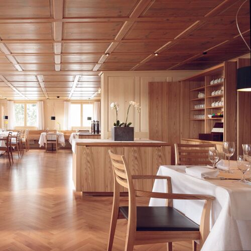 The town-centre hotel, Krone Hittisau, dates back to 1838. Today, the restaurant on its first floor serves regional and seasonal cuisine with an emphasis on sustainability. Fantastic ingredients are showcased in delicious dishes such as fillet of char with coriander lentils, ginger and lemon foam, and ricotta gnocchi. Diners can also look forward to charming and attentive service in a thoroughly inviting setting. The tasteful blend of clean lines and warm wood finishings (all the lovely furniture is made by carpenters from the Bregenz Forest) can be found both in the guestrooms and the restaurant.