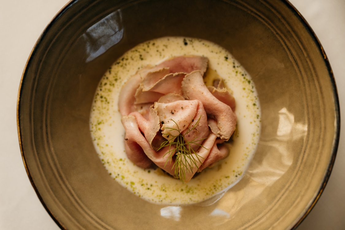 The menu at Štanjel follows the path of the seasons and territoriality, of the daily market, and for this reason changes constantly, except for the welcome. That small glass of Gregor Lisjak’s olive oil served with Piran salt and an olive: “At one time,” continues Komel, who works alongside his wife and daughters, “there were also many olive trees in this area, and for about the last fifteen years their cultivation has been recovering: that’s why the welcome we give our clients is with oil; by placing the oil at the center of the plate, like a course, it is a way of giving it importance and making it an integral part of the tasting experience.”