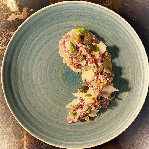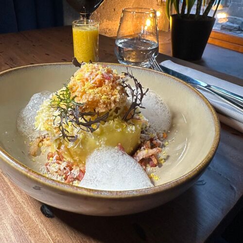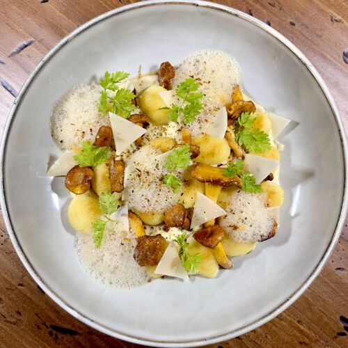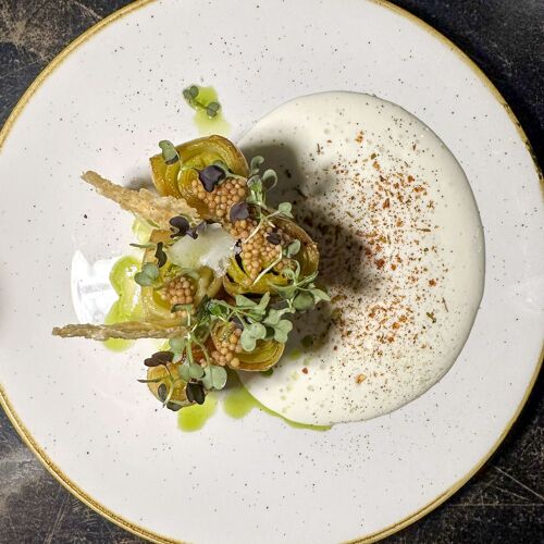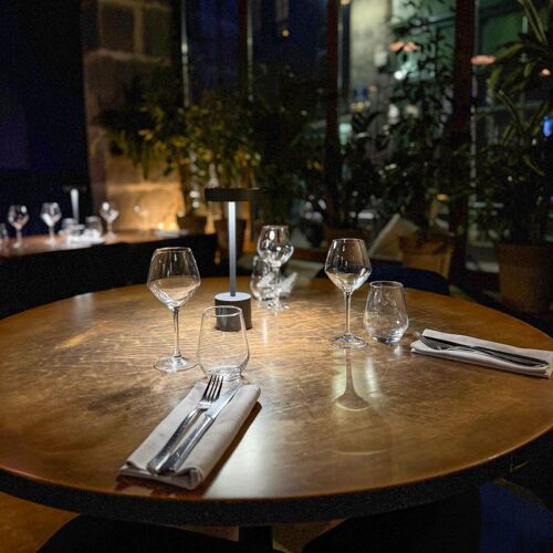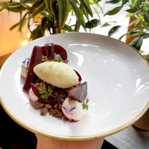 Located in the historic town, this revamped bistro, which sports a smart, cosy interior appointed in midnight blue velvet seats and matching walls, sings an ode to Italy. The youthful chef signs an uncluttered, spontaneous Italian-inspired score in a bistronomic register: tonnato of courgettes; confit of pork belly, orzotto of spinach and pistachio pesto; pan di Limone, creamy lemon and raspberry mascarpone. Reasonably priced concise menu at lunchtime, more ambitious in the evenings.