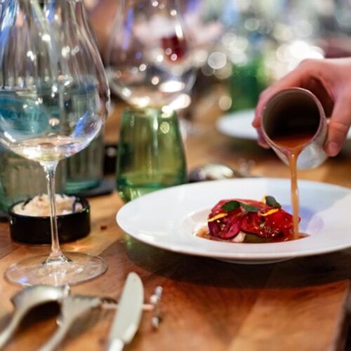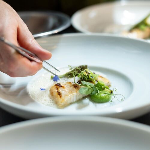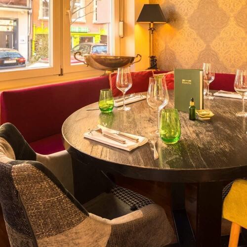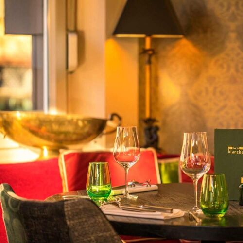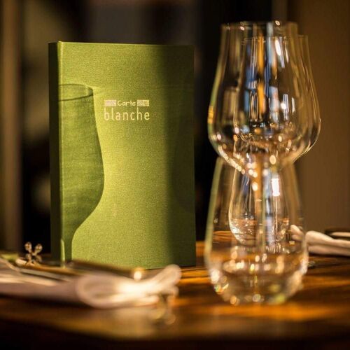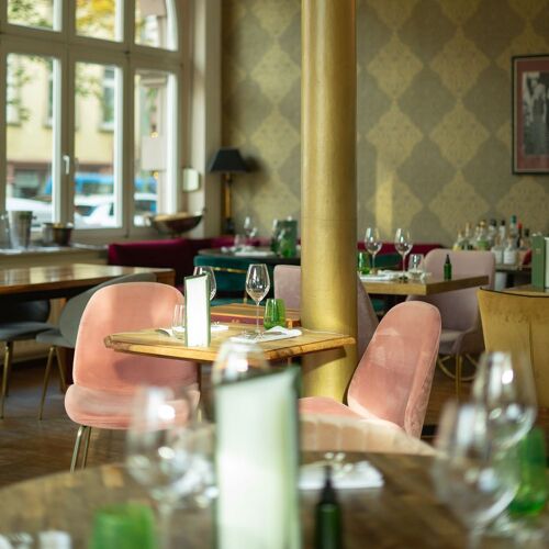 As the name "Carte Blanche" suggests, there is no fixed menu here; instead a surprise six-course menu is served – and a four-course version is also available Wed-Thu. Wine pairings for the individual courses are available upon request. The cuisine is modern and seasonal – the summery tomato salad with mackerel ceviche or the charcoal-grilled sturgeon are tempting options. The emphasis is on artisanal craftsmanship; even the bread is made in-house. The restaurant boasts a lovely location in an attractive historical building on a corner plot with high ceilings decorated with moulding, and unique interior details that contribute to a charming atmosphere.
