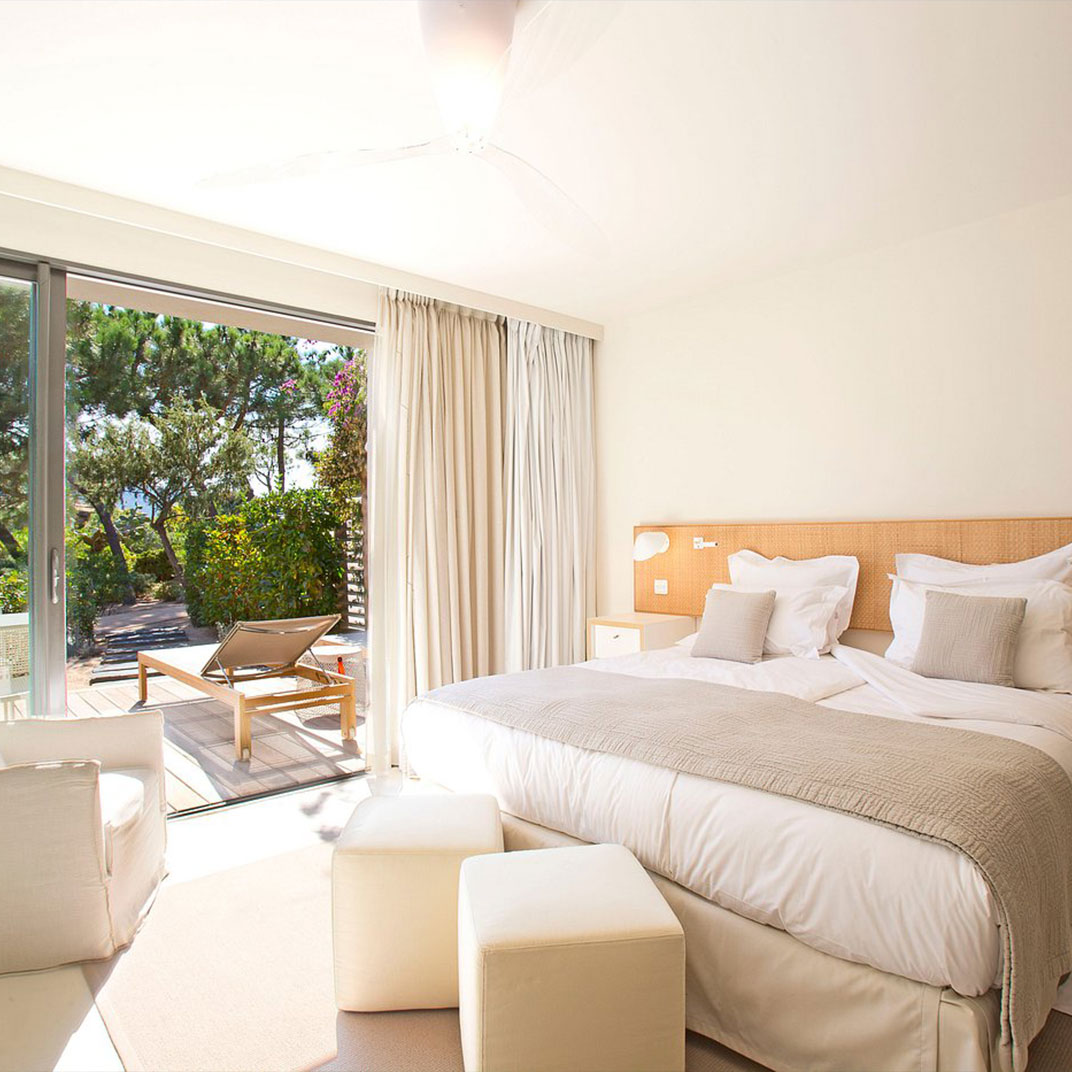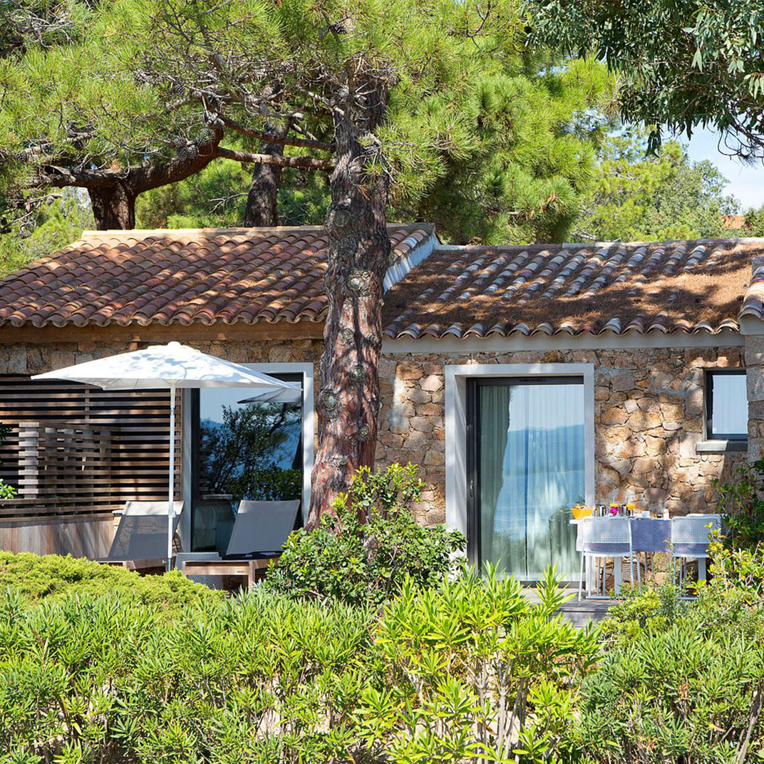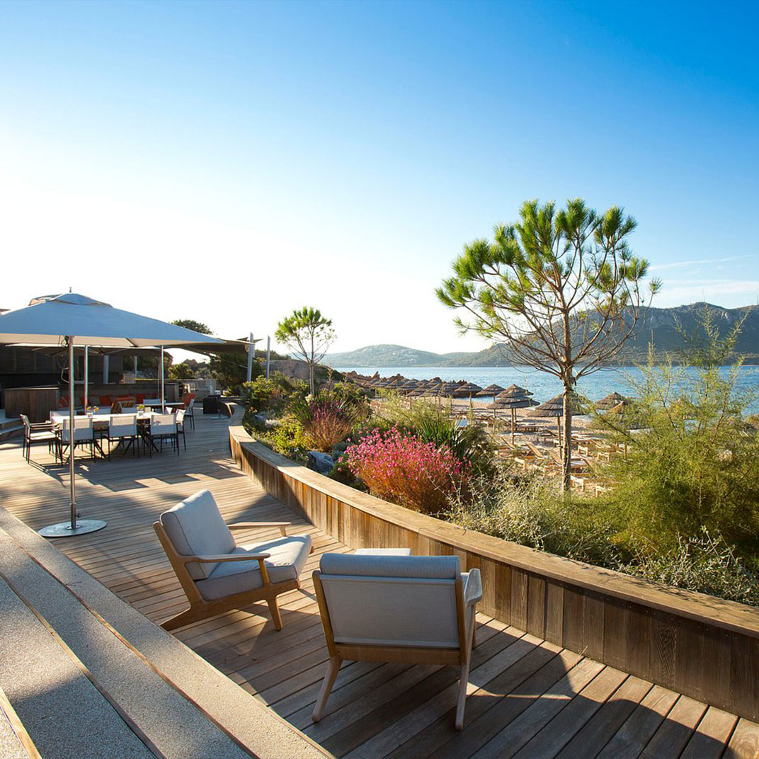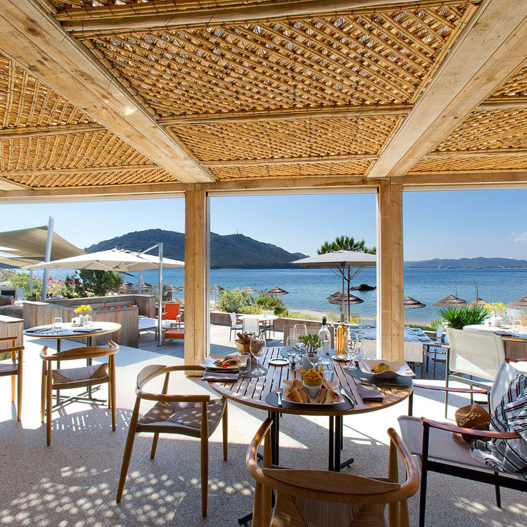 On Corsica’s south-east coast, La Plage Casadelmar makes the most of its setting, a sweep of pale sand framed by pine forest and sea. Its low-slung architecture, built from oak, stone, and glass, blends into a landscape of pines and pale sand. Rooms are bright and minimal, a few steps from the water’s edge, while the restaurant serves Mediterranean dishes under a shaded deck that catches the sea breeze. Days move easily between the terrace restaurant, the pool, and the calm of the bay beyond.