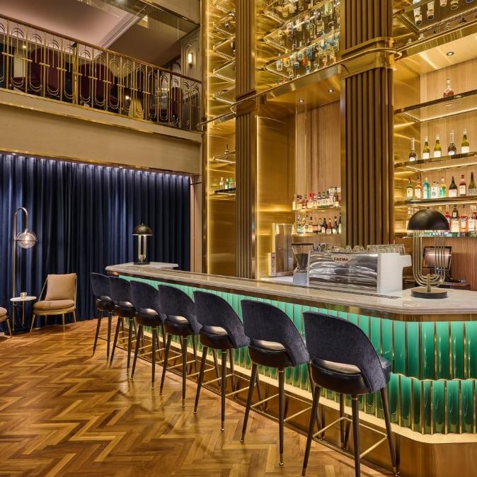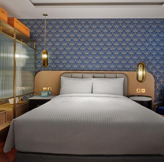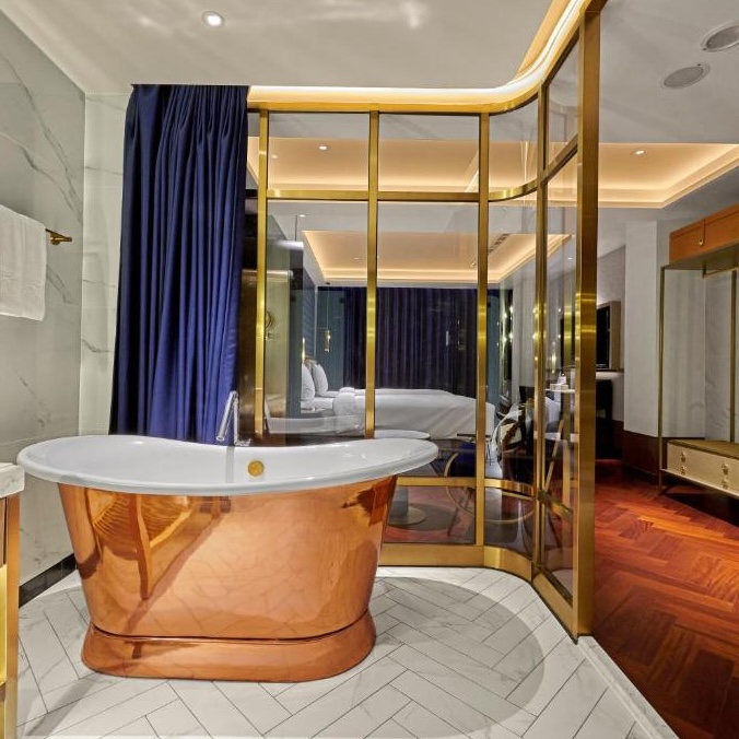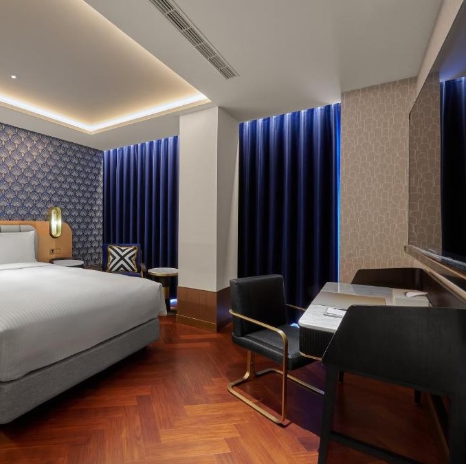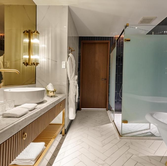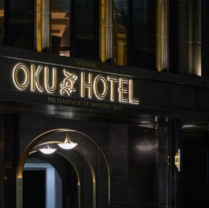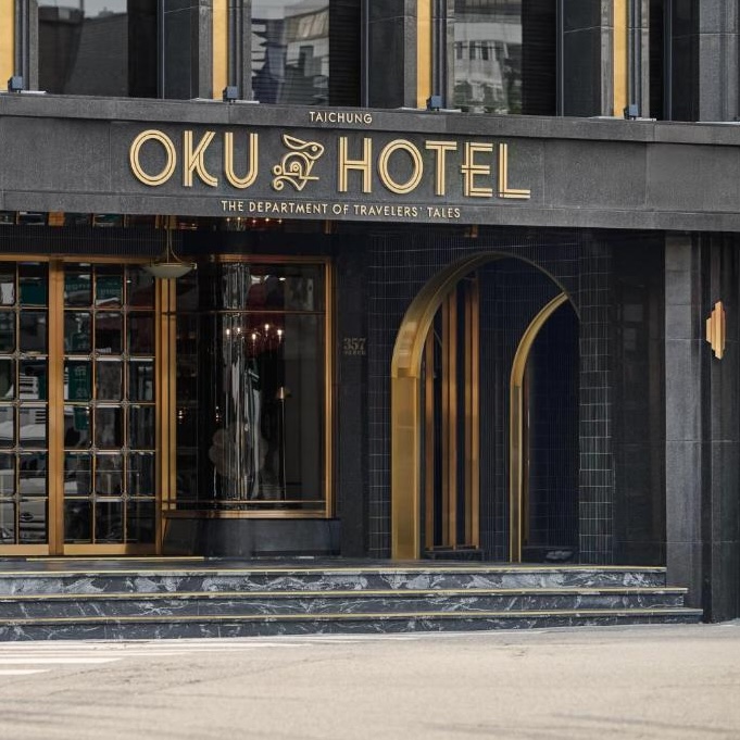 OKU Hotel claims a quiet Taichung street where old trades once operated. The guestrooms push Art Deco motifs with scalloped wallpaper in navy and gold, brass-framed partitions separating sleeping quarters from copper soaking tubs, herringbone parquet underfoot. The design commits fully: even the three-story wine tower in the lobby feels like set dressing from another era. Lumen handles all-day dining with a menu that spans Taiwanese and European influences, while The Ailise Bar upstairs pours cocktails in low-lit private rooms. There is a small gym and meeting space tucked away. It is theatrical without tipping into pastiche, a hotel that knows exactly what it wants to be.