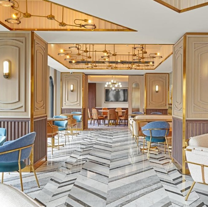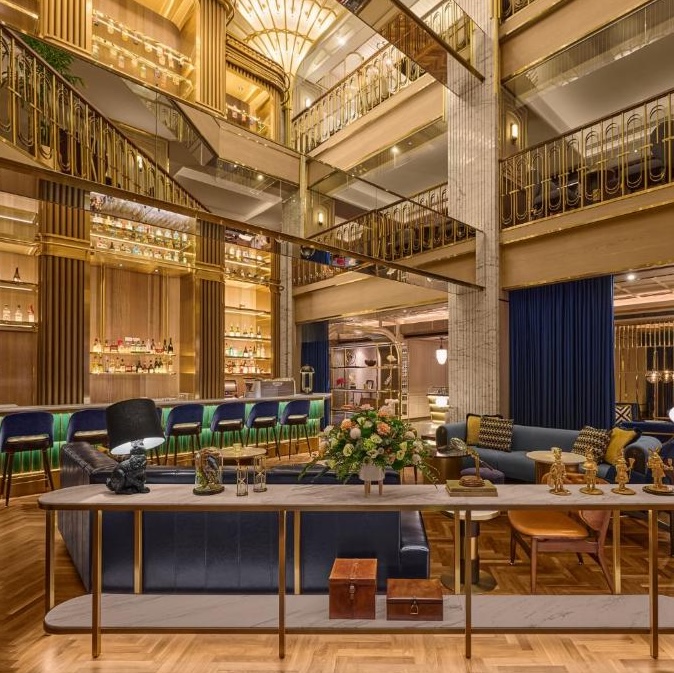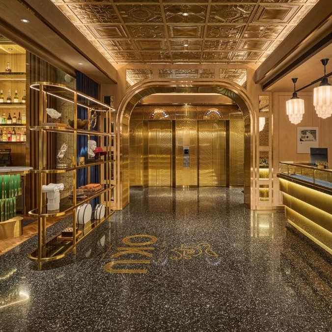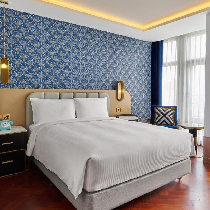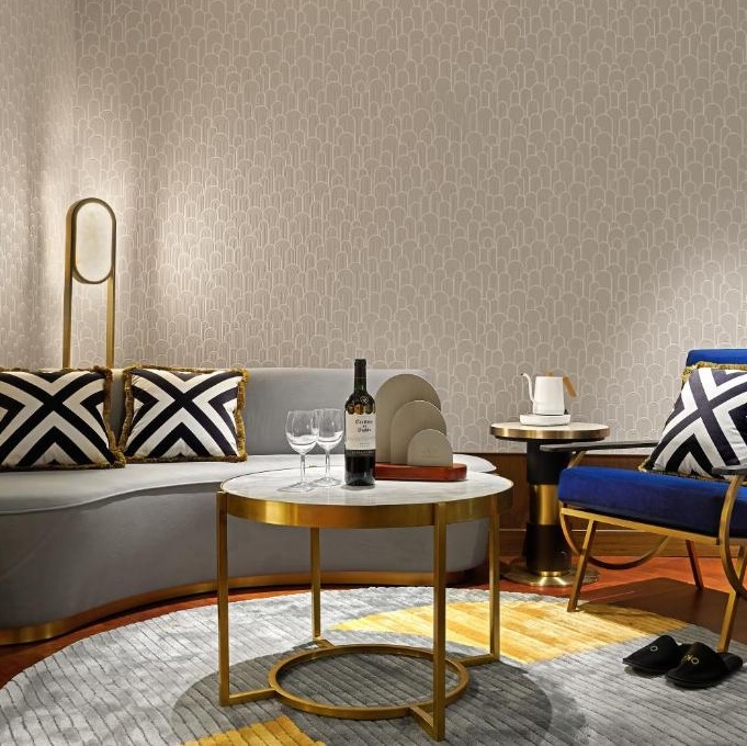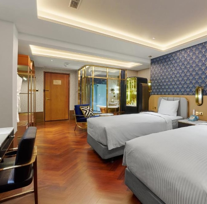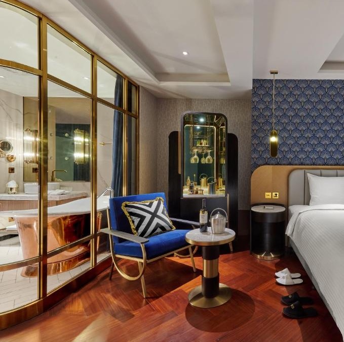 OKU Hotel claims a quiet Taichung street where old trades once operated. The guestrooms push Art Deco motifs with scalloped wallpaper in navy and gold, brass-framed partitions separating sleeping quarters from copper soaking tubs, herringbone parquet underfoot. The design commits fully: even the three-story wine tower in the lobby feels like set dressing from another era. Lumen handles all-day dining with a menu that spans Taiwanese and European influences, while The Ailise Bar upstairs pours cocktails in low-lit private rooms. There is a small gym and meeting space tucked away. It is theatrical without tipping into pastiche, a hotel that knows exactly what it wants to be.