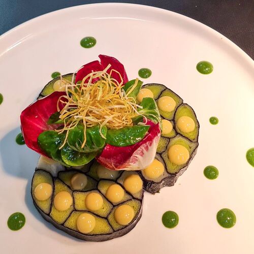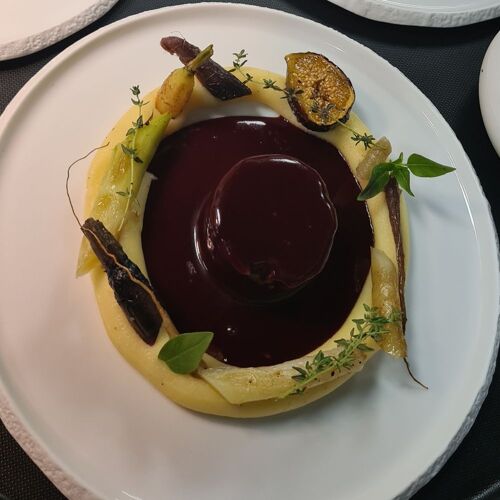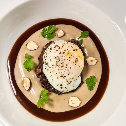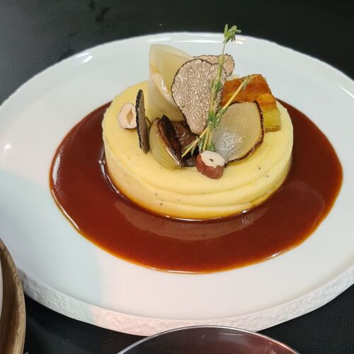 Pierre Grein (one MICHELIN star in his eponymous restaurant) has set up his bistro in the wine cellar and delicatessen part of the restaurant: the roomy and pleasant space is set apart and has a contemporary decor enhanced by shelves lined with fine wines and delicatessen wares (jars of conserves, salt, tea etc). The menu features a choice of dishes as well as a set menu without options. The chef's enthusiasm is palpable in his seasonal bistronomy creations, which are really well done and sit alongside the good old bistro classics: truffle croque monsieur, Carnaroli risotto inspired by the Creole dish rougail, steak tartare, or fillet of Charolais beef with chips and Béarnaise sauce. Thank you, Chef!