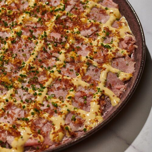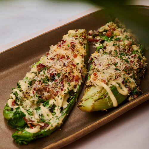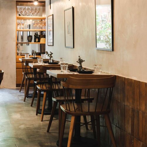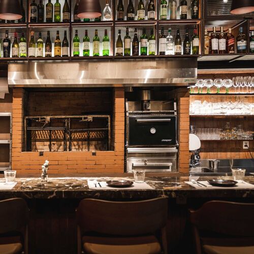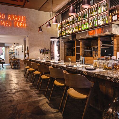 To the backdrop of a neon sign “Não apague o meu fogo” (“Don’t put out my fire”) clearly visible above the door, chefs Pepo Figueiredo and Newton Rique showcase cuisine in which fire plays a key role here, enabling them to prepare fresh ingredients imbued with a special flavour. In this industrial-style ambience with a predominance of raw concrete, a sturdy tree takes centre stage in the middle of the dining room. There’s also the option of sitting at the counter by the grill to watch dishes and cocktails being prepared at close quarters. The menu is of course heavily focused on barbecued meats, although you’ll also find other options such as vegetables, fish and burgers. Dishes you won’t want to miss include the creamy oxtail croquettes and cubes of smoked tongue with aioli. The succulent French rack of lamb, served with chimichurri, is cooked to perfection.