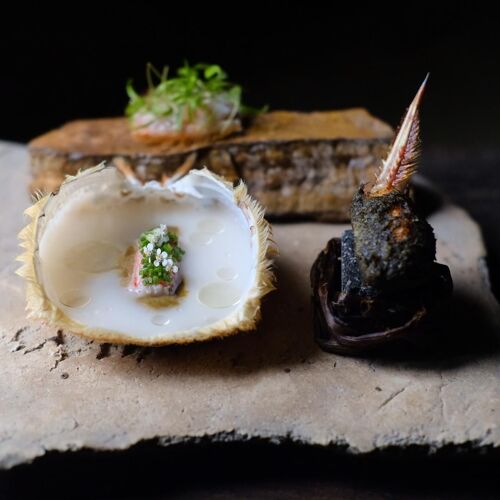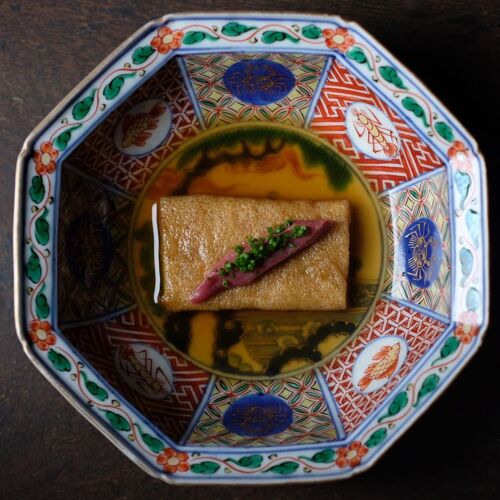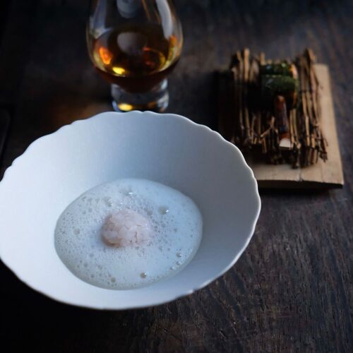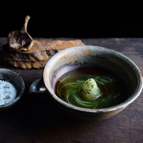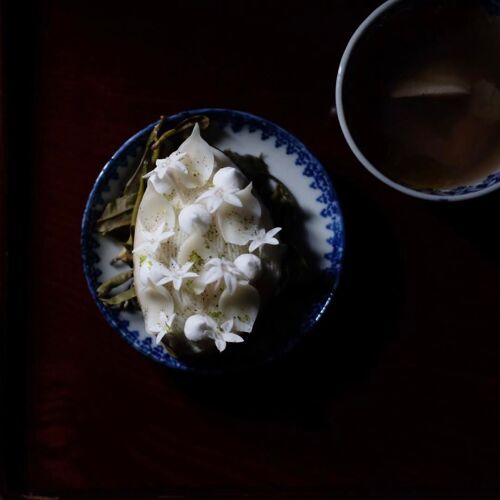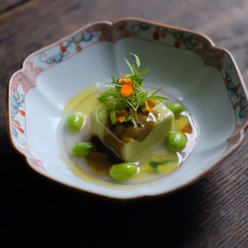 A genre-defying cuisine paired with tea-based cocktails. While rooted in French techniques, the chef seamlessly weaves in elements of Chinese and Japanese cuisine. The duck dish, for instance, is prepared by ladling hot oil over the skin, much like Peking duck. The tradition of serving tea and sweets after a meal, known as ochauke, reflects Japanese hospitality. Chef and mixologist work in harmony, refining the distinctive world of ‘wither and decay’ or ‘kokyu’.