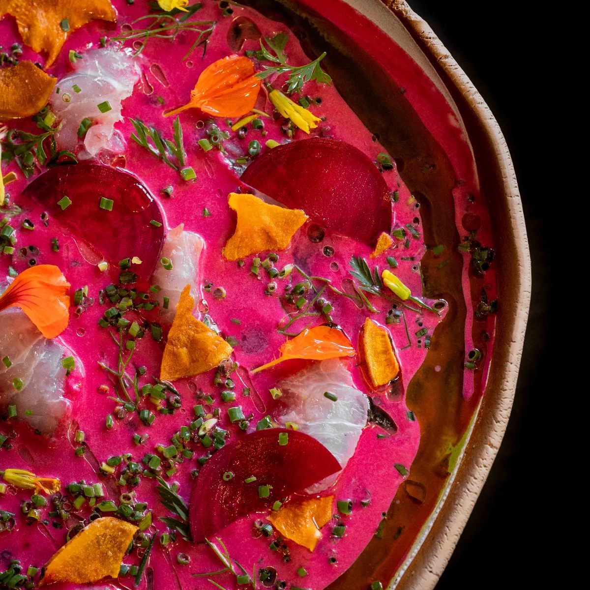 Imagen de cabecera: Ceviche de pargo con leche de tigre de remolacha, boniato frito y hoja capuchina, uno de esos platos que elevan la combinación de alimentos y la cocina, como disciplina, a la categoría de arte. © Flor Galarza - Terrae/Terrae