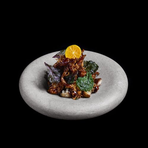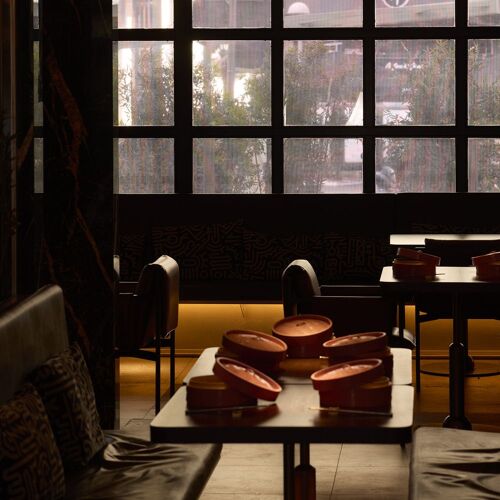 El amplio local, con un bello interiorismo a cargo del estudio de Lázaro Rosa-Violán, está llevado por el chef Daniel Villoria, la mano derecha de Dabiz Muñoz. La propuesta, con opción de carta y un menú degustación (Festival 360 º), refleja una gastronomía de fusión que pasea por casi todo Asia, incorporando tanto salsas como técnicas de wok y materias primas exóticas (yozukosho, tempura coreana, centollo Singapore, umeboshi, pasta Gochujang...) que se combinan con las nuestras. Dentro de su oferta, muy pensada para compartir, destacan sus Dumplings, los Huevos con morcilla, el mítico Cocido Hong Kong Madriz... sin olvidar bocados ligeros, pero llenos de sabor, como el Mollete al vapor de pintada o la Tortilla bèi tan zuo sī.