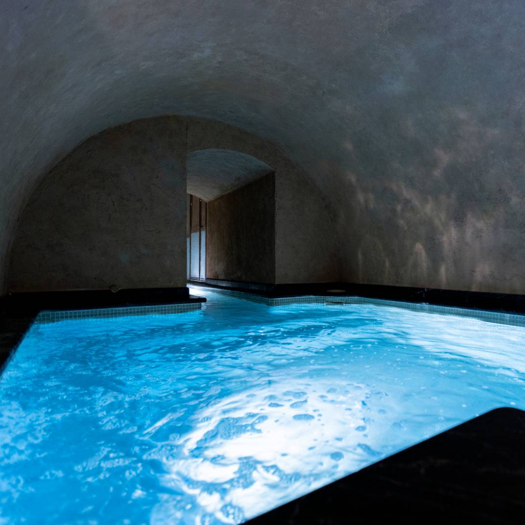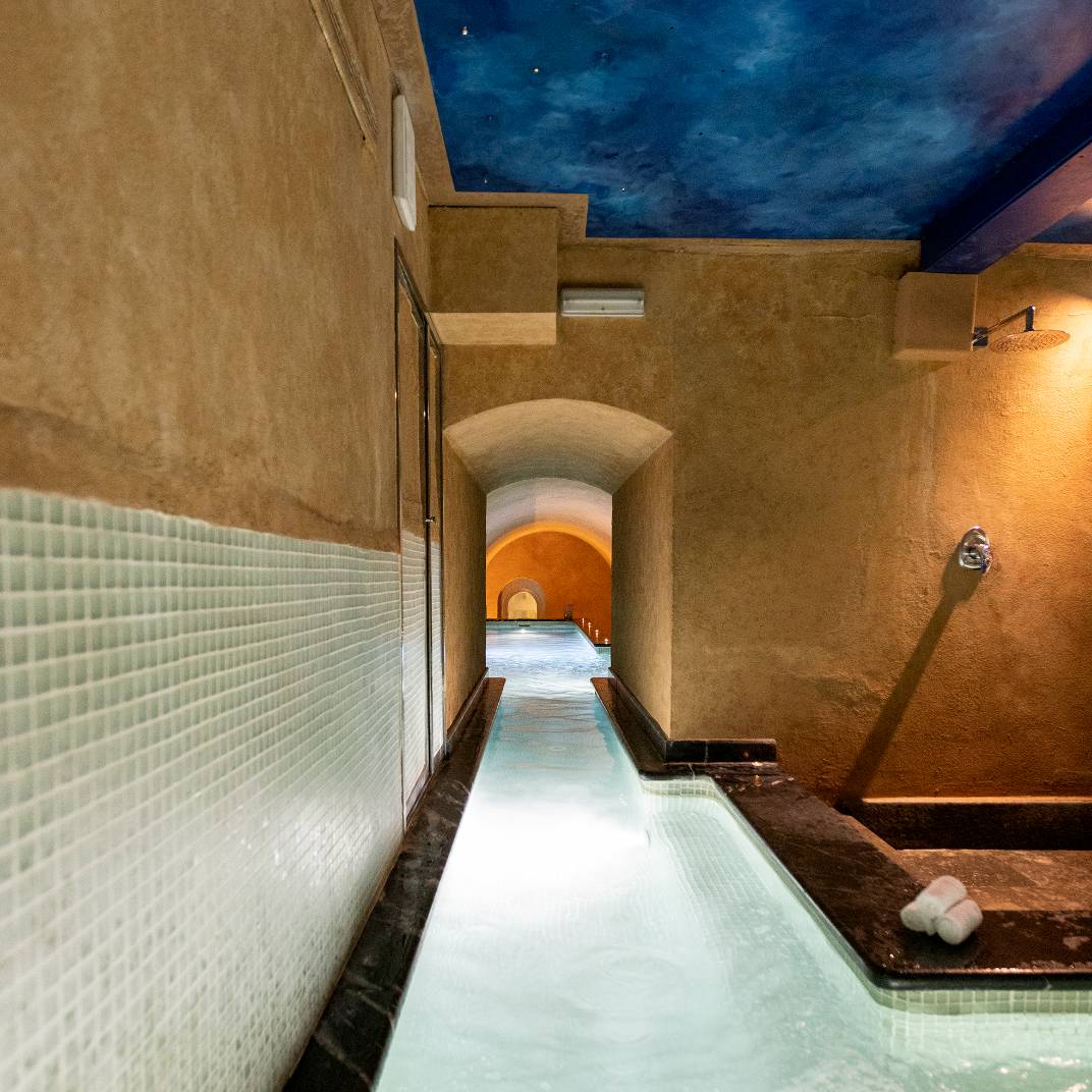 Se ha conservado gran parte de la estructura original, que data de distintas épocas; algunas habitaciones lucen frescos centenarios o antiquísimos arcos de piedra al otro lado de sus puertas antiguas. A través del suelo de cristal del atrio del edificio principal se ven las ruinas de una villa romana, que no hacen sino contribuir a la autenticidad histórica que se respira en los baños romanos del spa subterráneo.