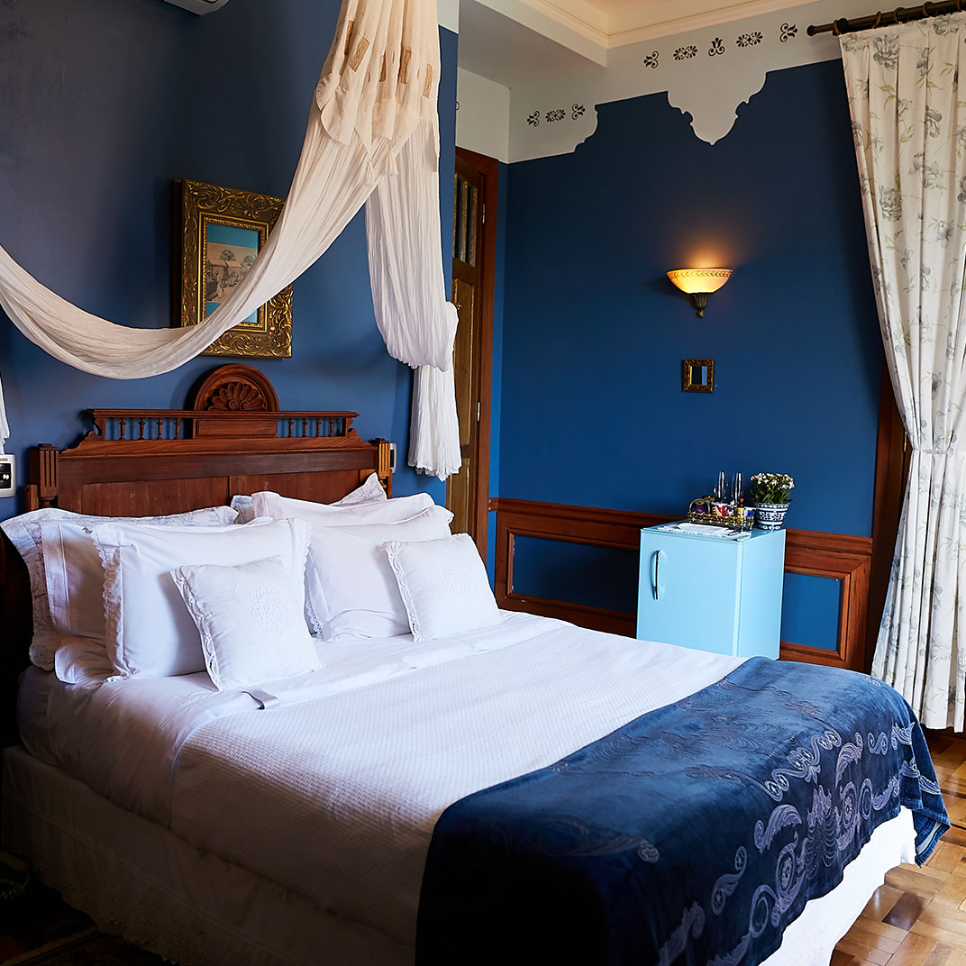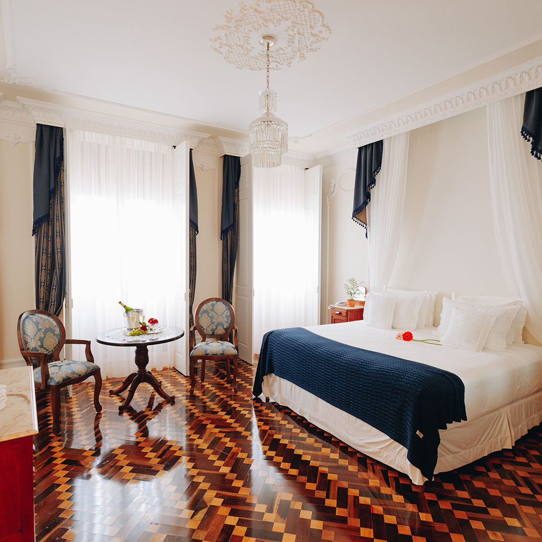 Con solo 16 habitaciones, los huéspedes pueden esperar un trato personal y atento. Entre los muebles de madera de sabor rústico se cuentan comodidades tradicionales como armarios inmensos y camas con dosel, con los que se borra cualquier sensación de complejo vacacional para jóvenes, a pesar del gran número de surfistas que acuden a la Praia Mole. Entre las habitaciones de mayor categoría están la suite Loft, con una habitación, un salón y una piscinita en la azotea, y la nueva suite Royal, con una rica decoración de estilo portugués con muebles antiguos, cortinas de jacquard de seda y lámparas de cristal. Las parejas que deseen hacer una escapada romántica deberían reservar la suite Master, en la que encontrarán sales minerales y velas surtidas. En los baños no encontrarás un estilo retro ya que, por suerte, abrazan la modernidad de un hotel de cinco estrellas, con dos lavabos, duchas ajustables, bañeras victorianas y puertas correderas de cristal.