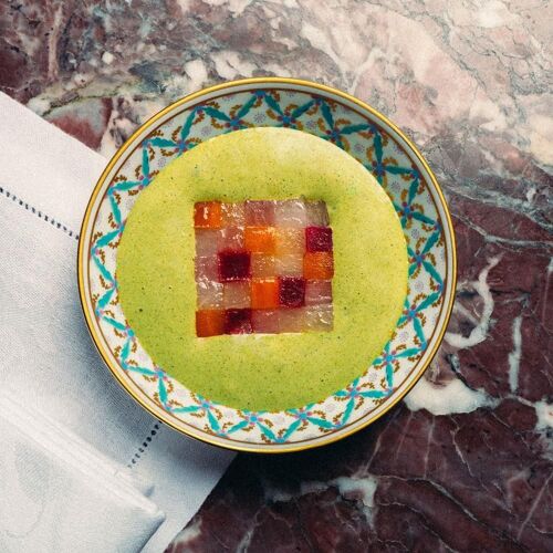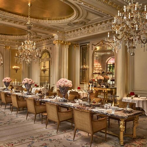 Media darling, Jean Imbert, is thriving in this iconic luxury hotel on Avenue Montaigne. In the company of a high-flying kitchen brigade, the “chef to the stars” jubilantly brings a fresh perspective to France’s culinary heritage: “Parisian” langoustines, seabass in a Chambertin sauce, lamb stew and the extravagant “grand dessert”, enthusiastically presented by a duet of pastry chefs… Seated at the majestic marble table d'hôte, surrounded by gilded moulding and chandeliers, how could you not fall under the spell?