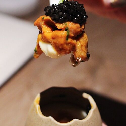 Brush Sushi is located in a swish shopping center with the likes of Rolex and Dior, but step inside this stylish space to discover O by Brush, a separate omakase counter helmed by Chef Jason Liang. The extensive procession will begin with several starters before moving into nigiri such as beautifully rich shima aji, warayaki sawara that is hay smoked over coals then sliced and filled with rice, and anago tempura temaki finished over binchotan coals. A tasting of dry-aged hirame and kanpachi is a delightful surprise, as is the tamago tasting, featuring the classic style alongside a tender, cake-like version. The wide-ranging sake selection, also available by the glass or carafe, is the perfect complement.