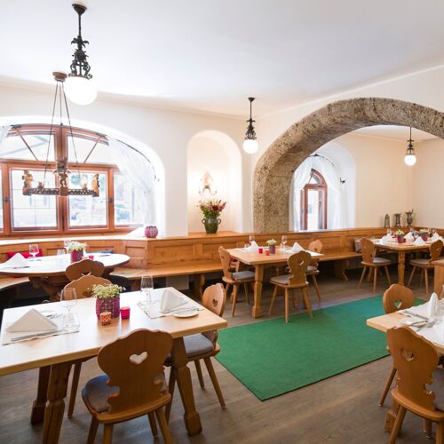 This place has a long culinary tradition to its name, dating back to 1909. The Döllerer family's inn is located in the town centre, not far from the parish church and the castle. The atmosphere is pleasantly lively and with a cosy, rustic charm. Food is served by friendly waitstaff in two dining spaces with historical vaulted ceilings or on the terrace to the rear of the building. The menu features mouthwatering dishes such as sturgeon with Piedmont hazelnuts or Rauris venison ragout, not forgetting the signature dessert Schwarzbeernock'n (blueberry dumplings) with sour cream ice cream. Delicatessen goods are also available for purchase, including meat products, cheese specialities and delicacies such as jams, Alpine spices, mustard etc. Overnight accommodation available at the adjoining Hotel Döllerer.