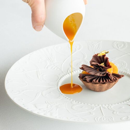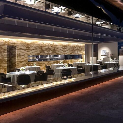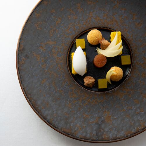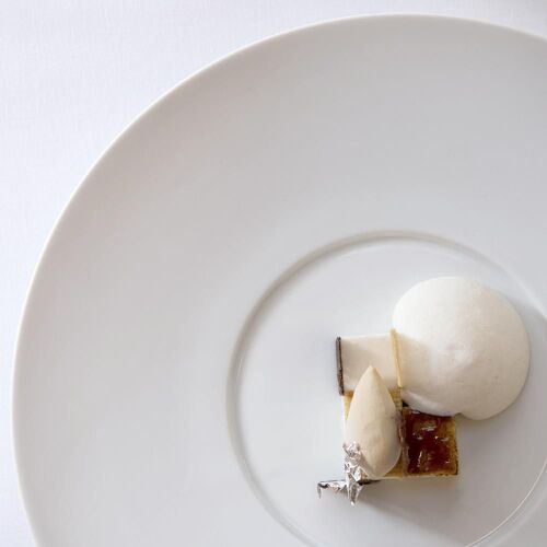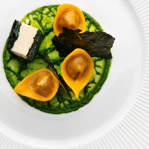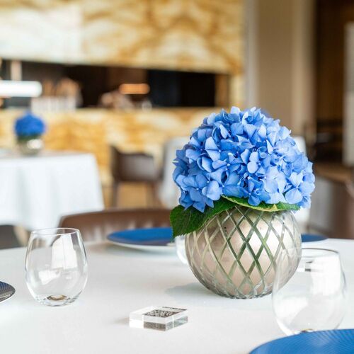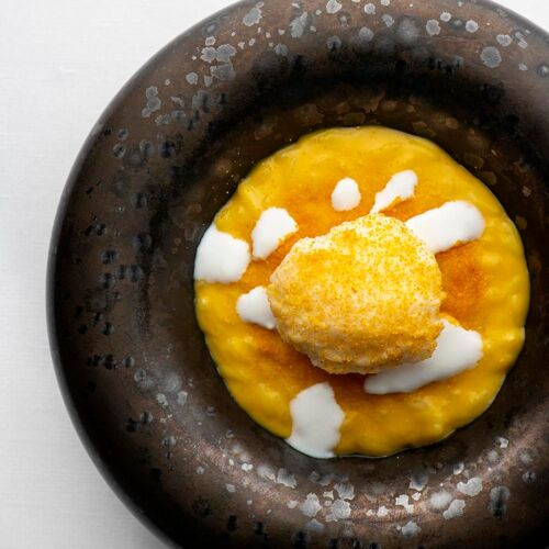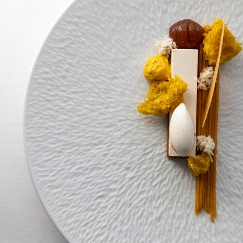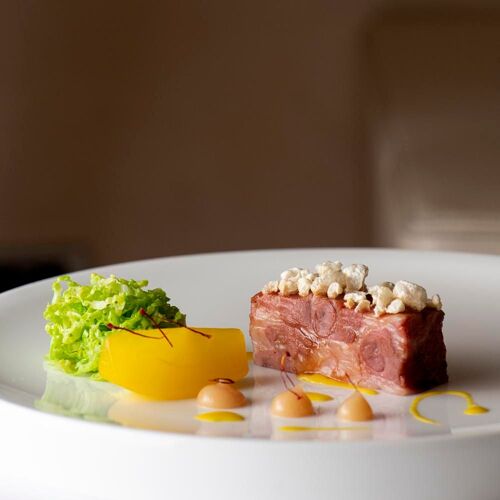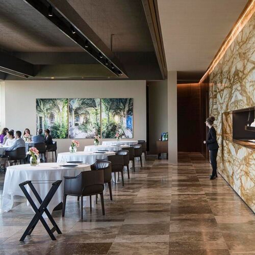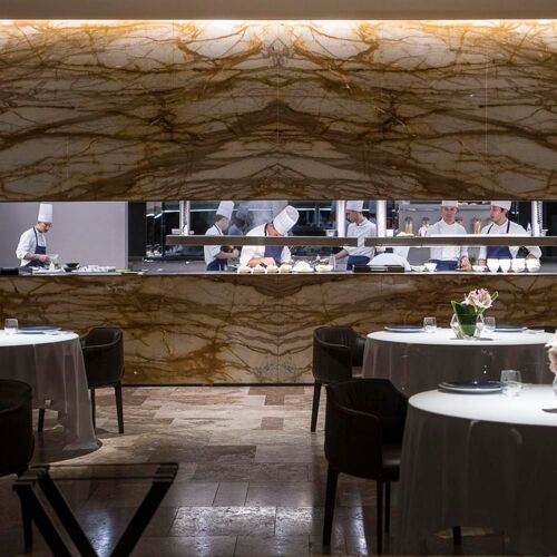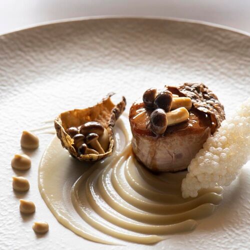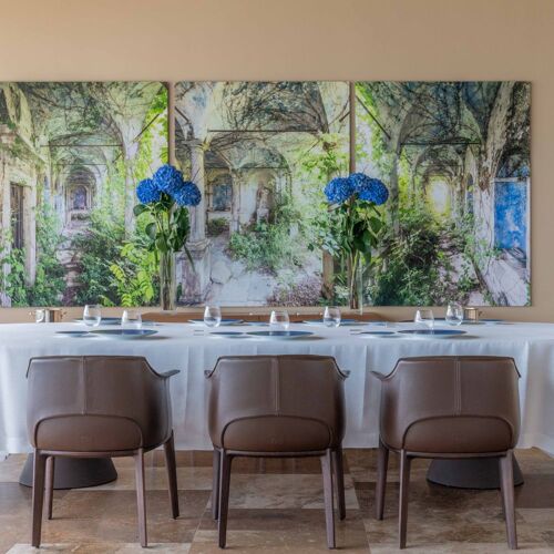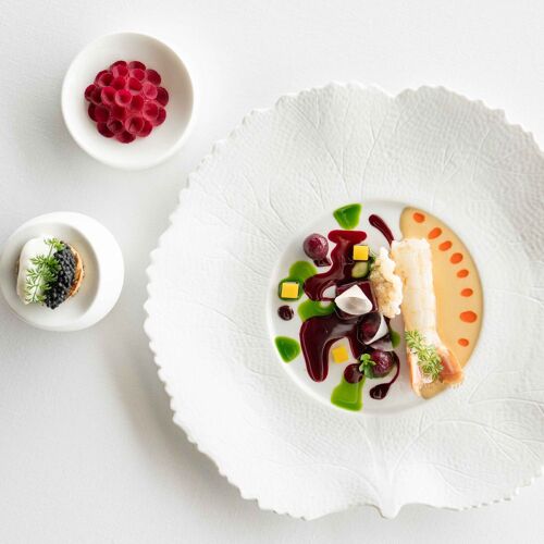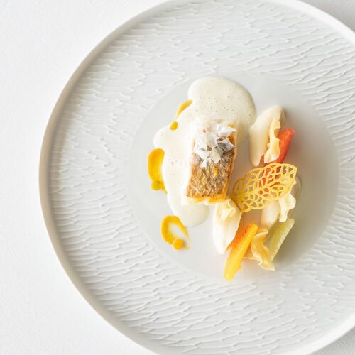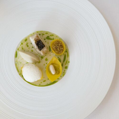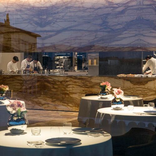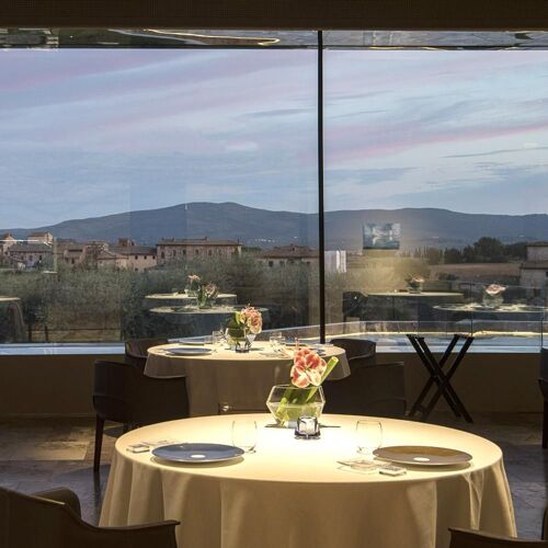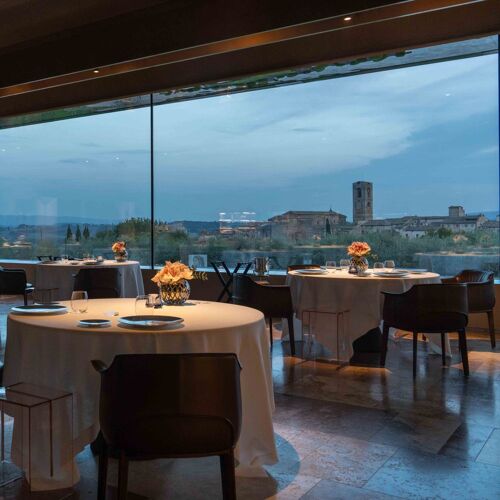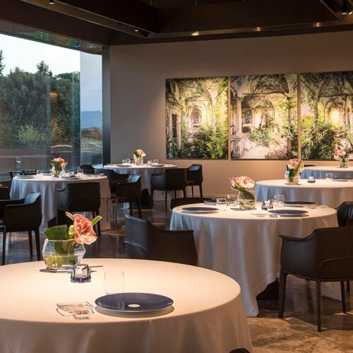 With sharp lines created by the use of iron and glass, this modern building is especially designed to allow guests to admire the views from wherever they’re sitting. To the rear of the dining room, the large open-view kitchen framed by a superb yellow Siena marble wall is home to chef Gaetano Trovato (Mentor Chef Award 2024) and his team. Although there are three tasting menus available, one of which is vegetarian, any of the courses can also be chosen à la carte style. We could say so much about Arnolfo’s cuisine, but we’ll limit ourselves to mentioning the bread (which has been central to this chef’s work from the very beginning), duck, Chianina beef, Valdarno chicken and the ice-cream which always features among the desserts. Our inspector particularly enjoyed the delightful amuse-bouche with which guests are welcomed, the caponata with Taggiasca olives and basil, and the mullet served with white asparagus, peas and mint. The wine list is impressive, both for its quality and for the extensive selection of wines not only from Italy and France but also from other countries around the world – 7,000 different labels in total.