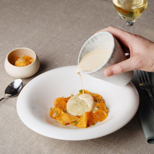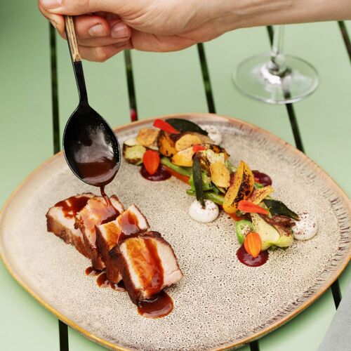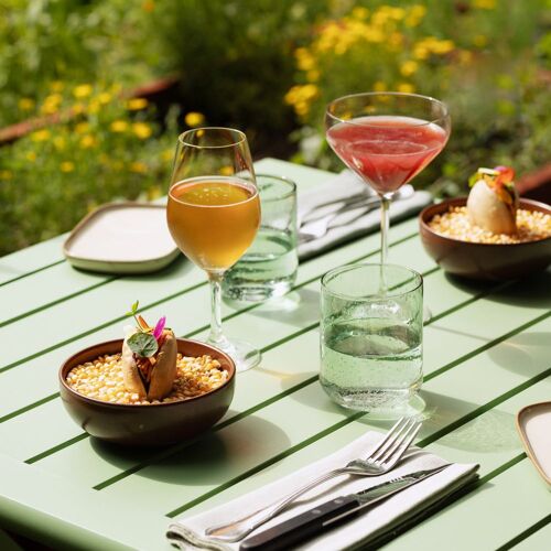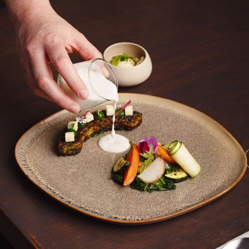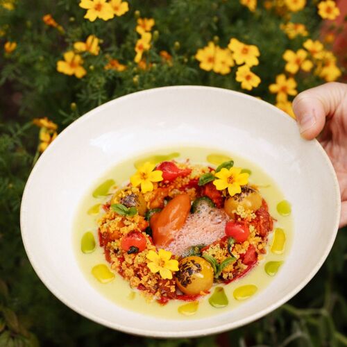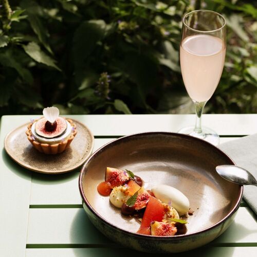 "La carte s’articule autour de deux grands axes : un menu « Herbae » au printemps-été, inspiré de la cueillette et du potager, et un menu « Cerealis » en automne-hiver, mettant en lumière le terroir local. Les protéines animales cèdent souvent la place aux protéines végétales faites maison (tofu, seitan, tempeh) ; les menus sont disponibles en version végétarienne. Pour sensibiliser les convives, on organise des ateliers autour de la fermentation ou de la cuisine des plantes sauvages."