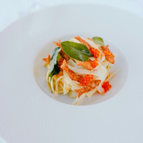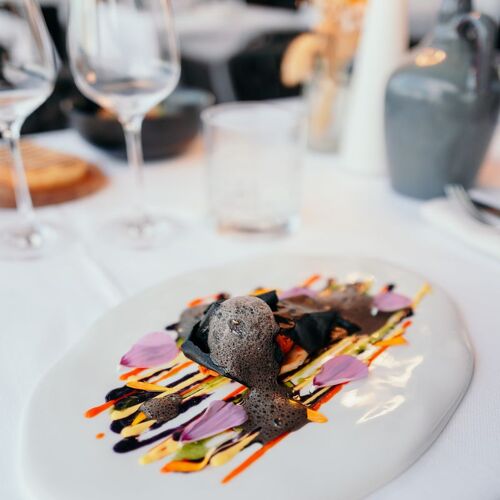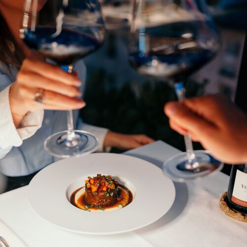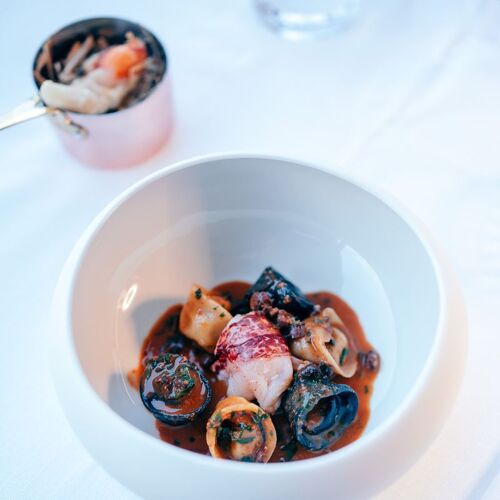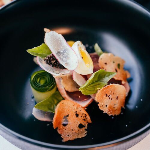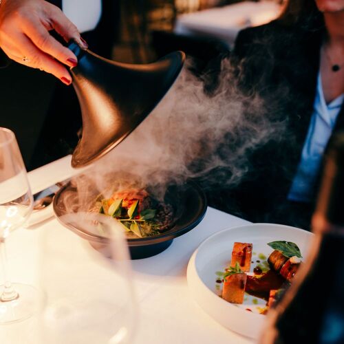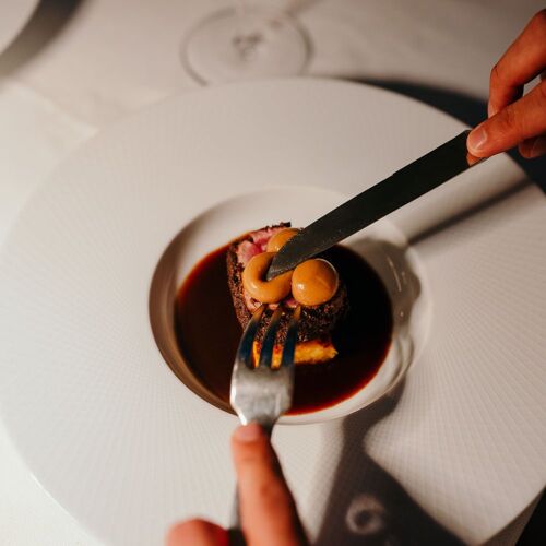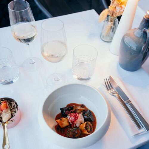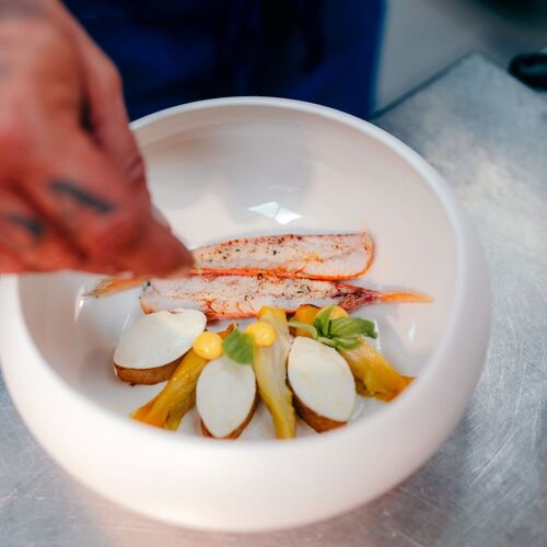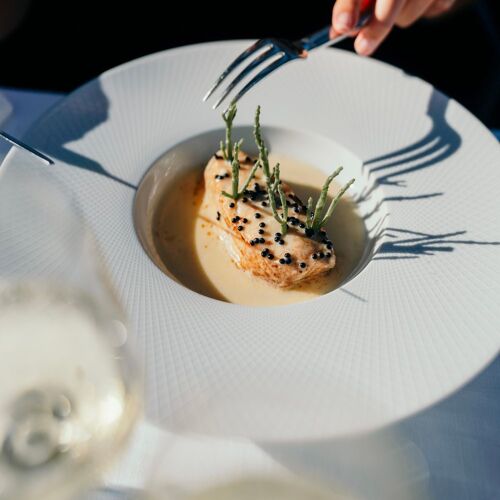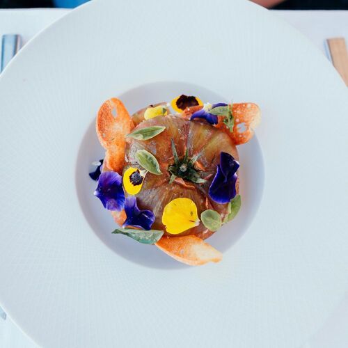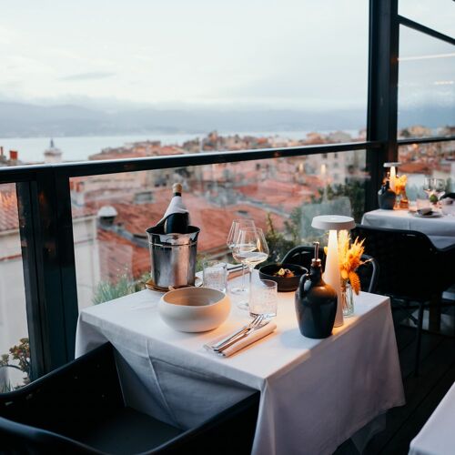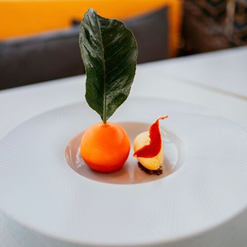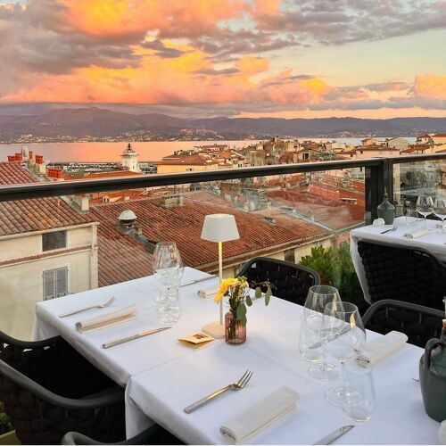 Juchée sur un toit d’hôtel, cette table offre une belle vue sur Ajaccio, la baie et la montagne environnante. Avec ses parois modulables, elle s’ouvre et se ferme à volonté, en fonction de la météo. De la cuisine ouverte, on aperçoit le chef Franck Radiu s’activer sur fond de musique électro. Pâtissier de formation, cet enfant de la ville propose une partition bien rythmée grâce aux richesses du terroir corse. Ce soir, un cannelloni d’araignée de mer, twisté par des suprêmes de pamplemousse, un pagre sur des palets de pommes de terre nappés d’un bon jus de bouillabaisse, et un citron en trompe-l’œil en fine coque de chocolat blanc, dessert léger et acidulé.