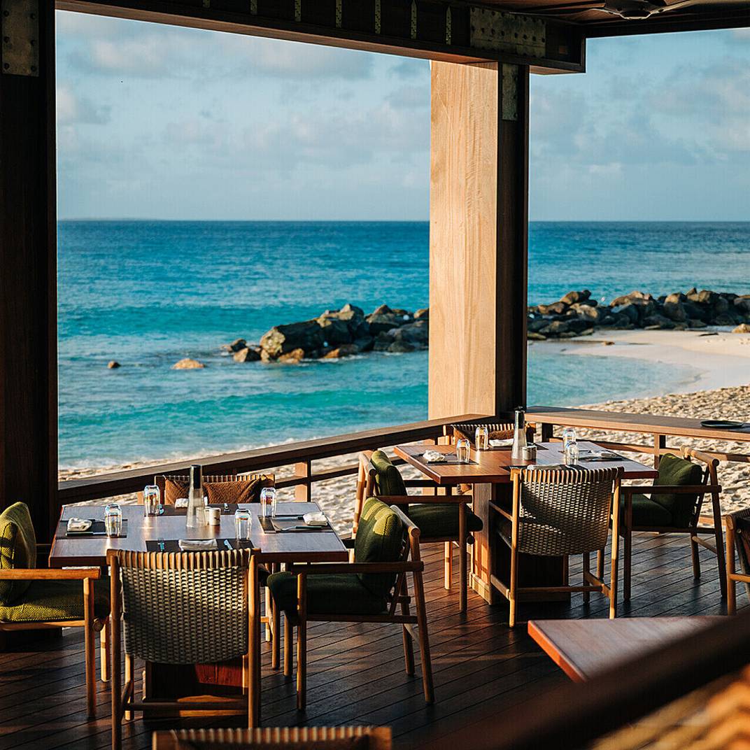 En phase avec le bruit des vagues et le rire lointain des pêcheurs, les chambres ne sont qu’ordre et beauté : palette crème et sable, persiennes coulissantes, fraîcheur du marbre et voilures des baldaquins soulevées par la brise, de quoi laisser tomber maillots et paréos pour des vêtements amples et translucides, d’un plus grand chic pour arpenter la plage et son ponton telle une allégorie de publicité. Anguilla n’est ni Miami ni L.A., mais le temps qu’il faut pour s’en rendre compte est inversement proportionnel à celui qu’il faut pour s’en remettre.