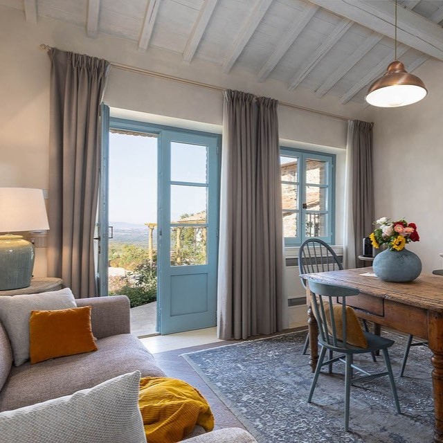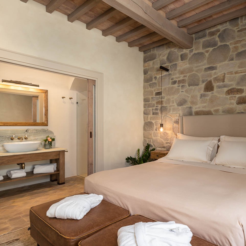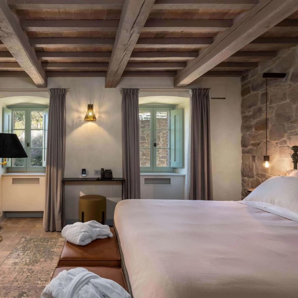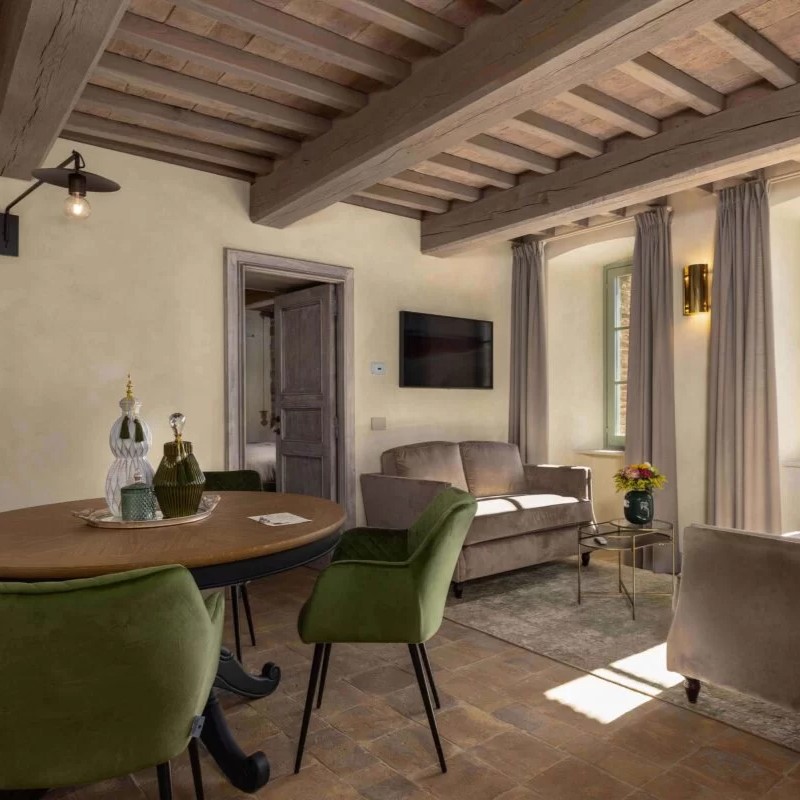 Les chambres revisitent avec brio l’atmosphère des fermes traditionnelles grâce aux poutres apparentes et aux murs de pierre. Les suites ajoutent des prestations de luxe sous la forme de bains à remous, de baignoires à l’ancienne et de lits à baldaquin. La suite présidentielle occupe le premier étage d’un édifice qui abritait une abbaye du XIIe siècle, et qui dispose aujourd’hui de son propre spa.