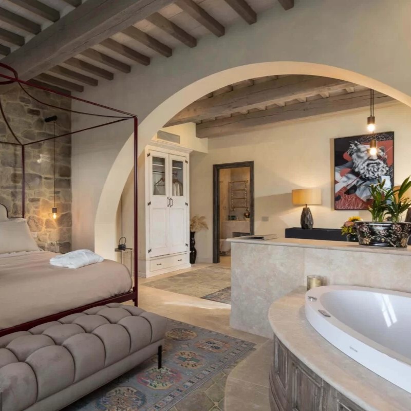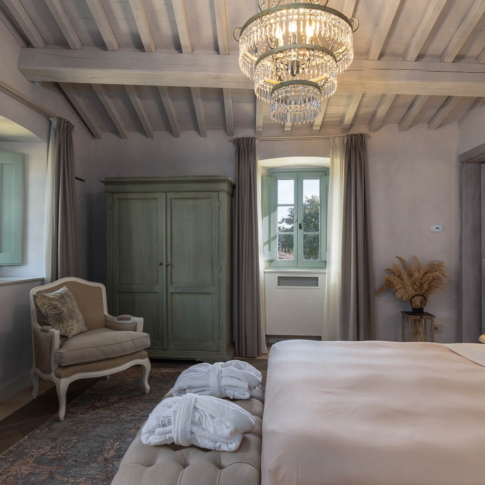Certains espaces sont destinés à accueillir en premier lieu des événements, un mariage pittoresque, une conférence sortant des sentiers battus : salles intérieures, jardins extérieurs et pelouses bordées de zones boisées avec en ligne de mire de lointains coteaux. Pour la clientèle hôtelière, le « village » de San Giovani est le cœur du domaine avec 15 chambres et suites, ainsi que le restaurant Essenza.